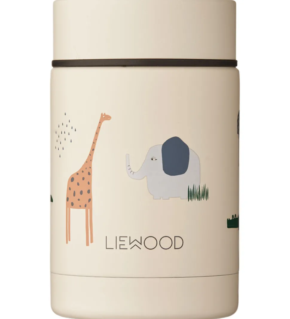 Praktisk Liewood termobeholder i beige med et allover print med det velkendte safari-tema.