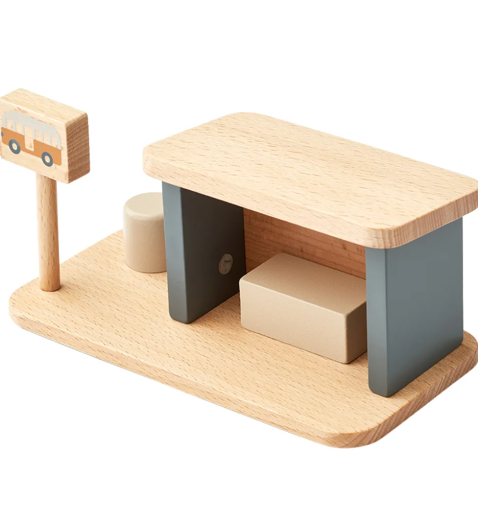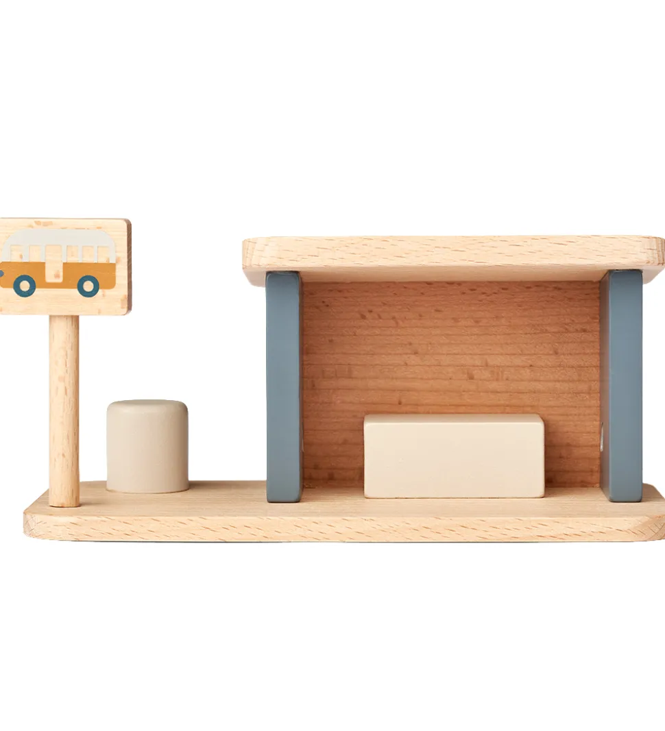 Flot Liewood trælegetøj i form af et busstoppested i malet træ med afdæmpede farver.