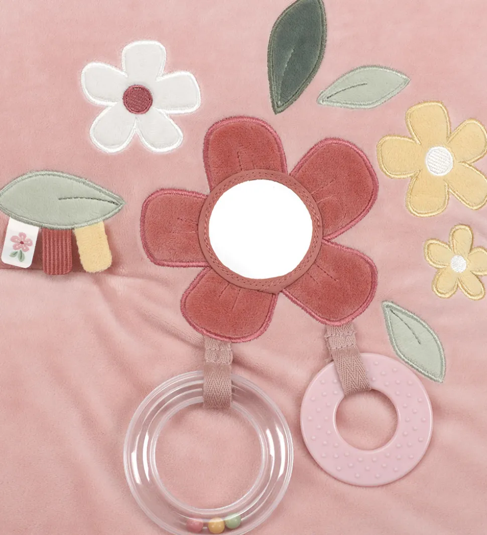 Charmerende Little Dutch legetæppe i en blød rosa nuance med søde, påsyede dyr og blomster. Legetæppet har et påsyet spejl, som barnet kan se sig selv i. Derudover er der en rangle og en bidering, som barnet kan lege med og bide i. Legetæppets motiver har forskellige strukturer, og blomsternes blade samt sommerfuglens vinger siger en knitrende lyd, som giver barnet en sanselig oplevelse.