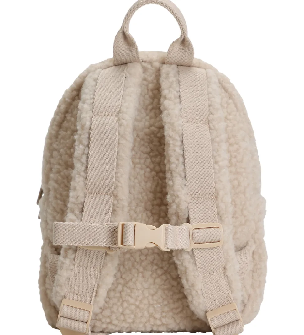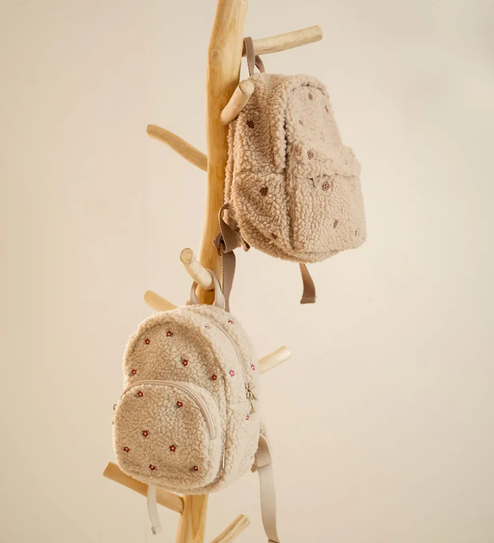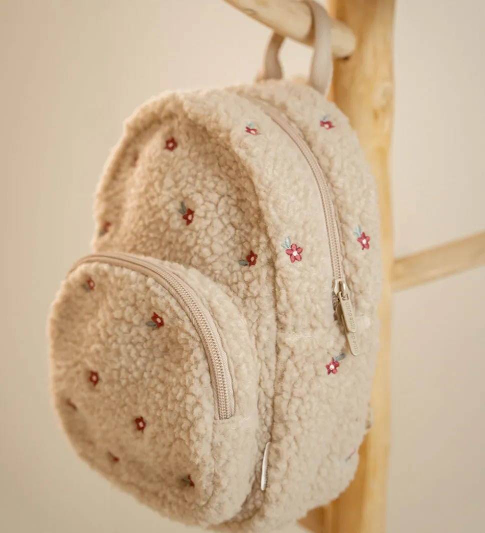 Skøn Little Dutch rygsæk i beige teddyfleece med broderede blomster.