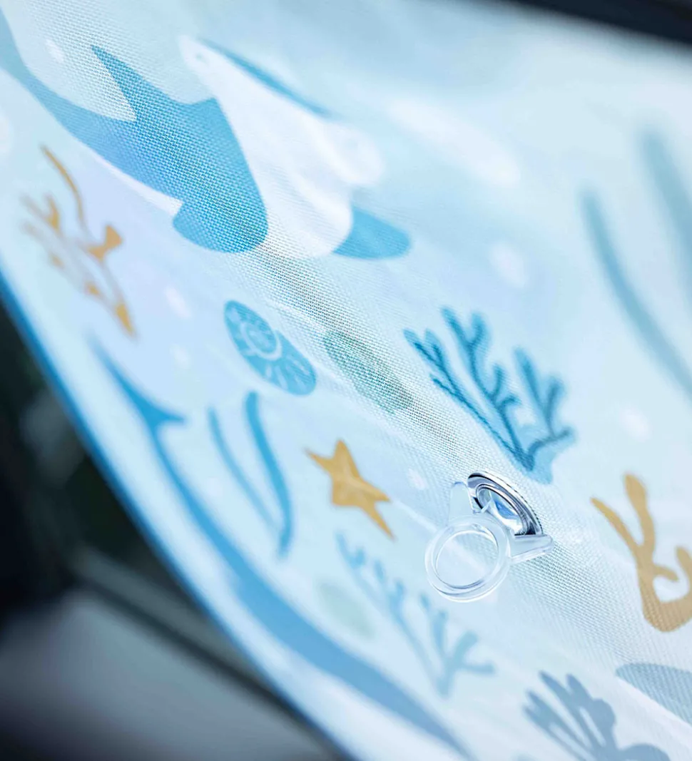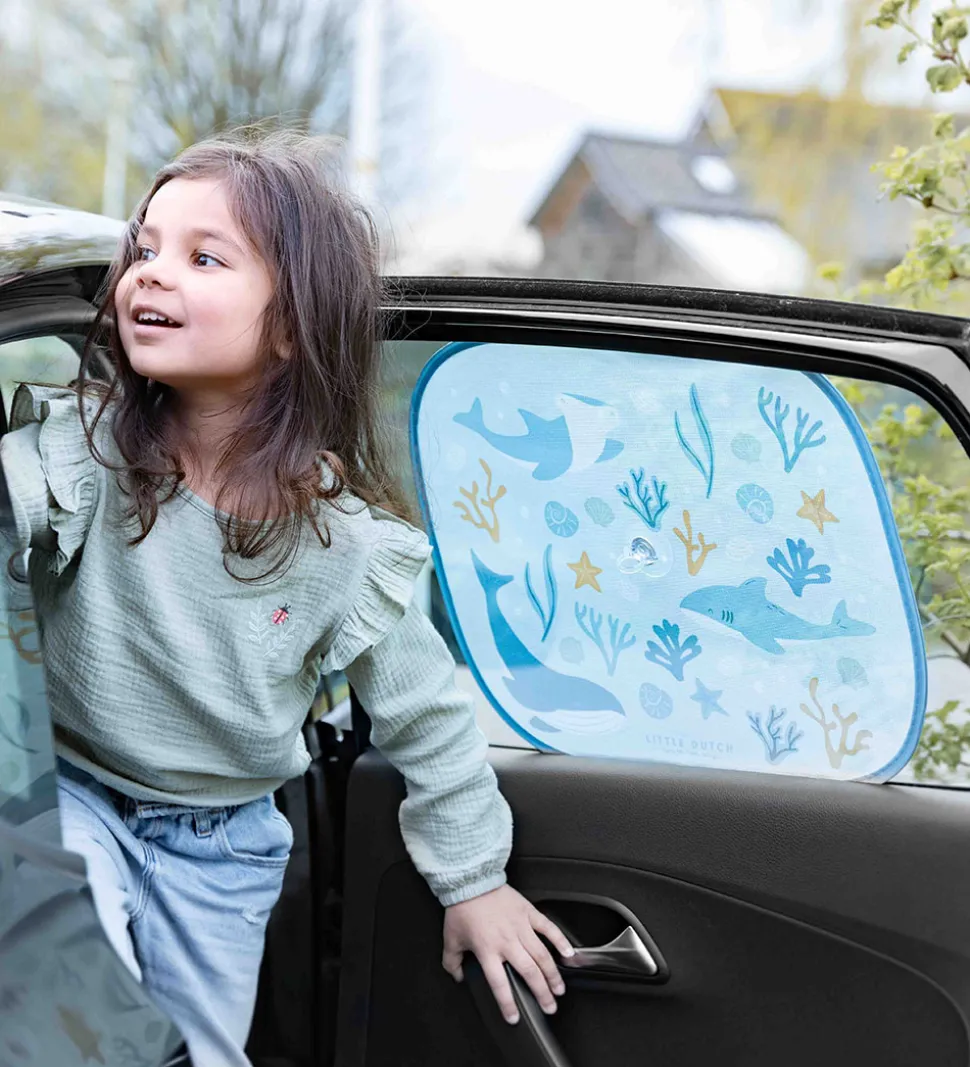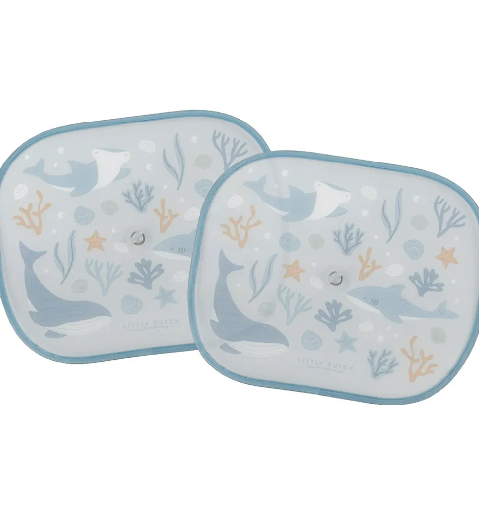 Søde Little Dutch solskærme solgt i en 2-pak i blå med print af havdyr og -planter. Solskærmene er både hyggelige at se på, samtidig med at de beskytter mod sollys. Solskærmene passer til de fleste bilruder.