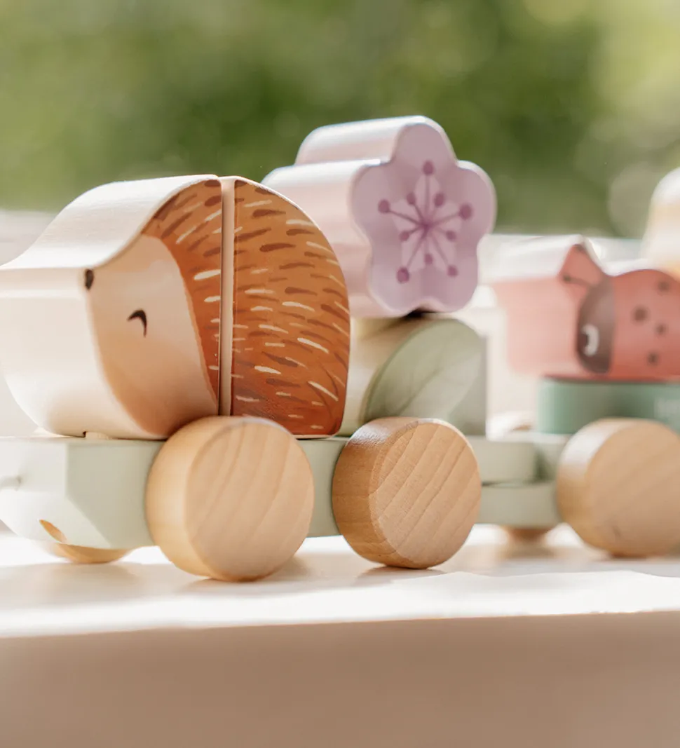 Little Dutch stabletoget har små hjul og en lang snor, så barnet kan trække det efter sig. Klodserne i det hyggelige tema skal stables på toget og køres med på tur.