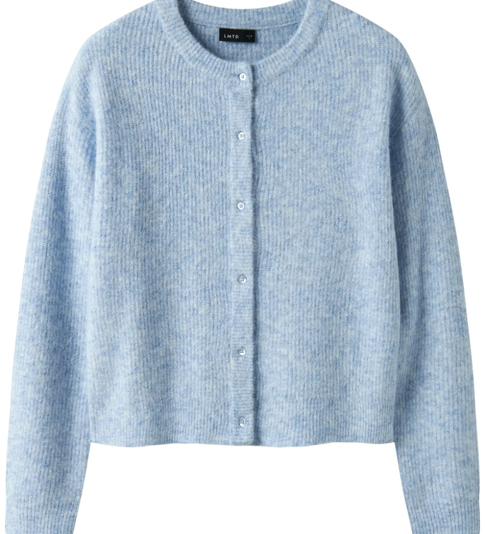 Smart LMTD cardigan i meleret lyseblå med ribstrikket struktur. Cardiganen har en rund halsudskæring og gennemgående knapper fortil.