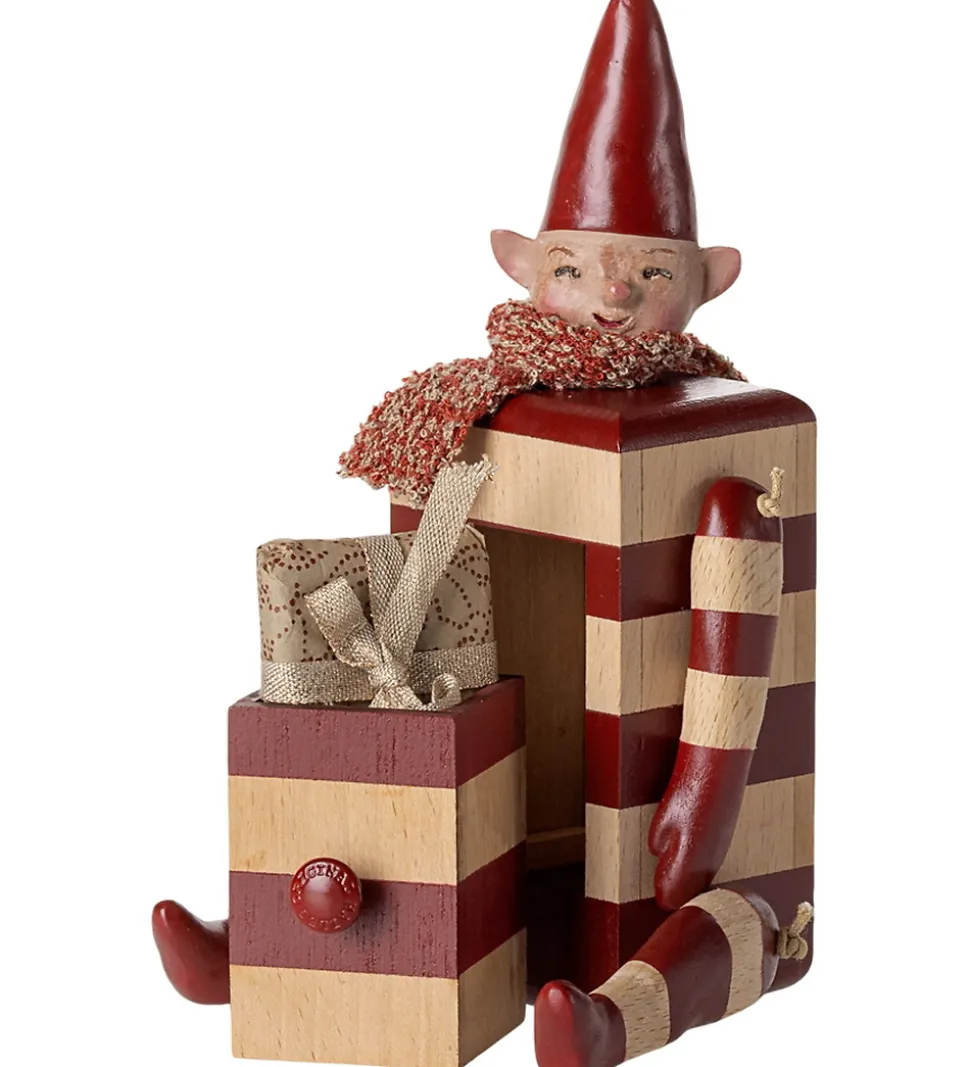 Charmerende Maileg alf med røde og naturfarvede striber samt en spids, rød nissehue. Maileg alfen har en hemmelig, lille skuffe, hvilket gør den til en yndig tilføjelse i ethvert hjem. Perfekt til at skabe julestemning.