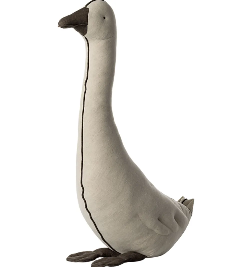 Fin Maileg gås i en naturfarvet hør og bomuldsblanding med gråt næb, øjne og fødder og en grå stribe langs maven og ryggen.