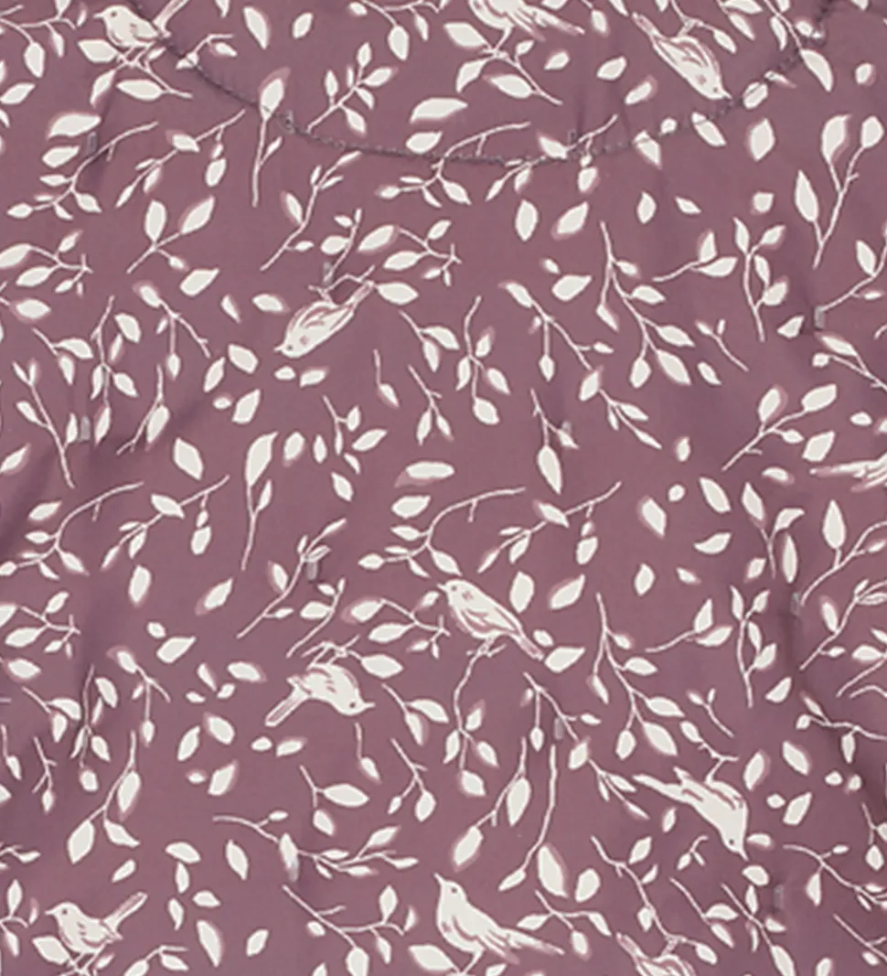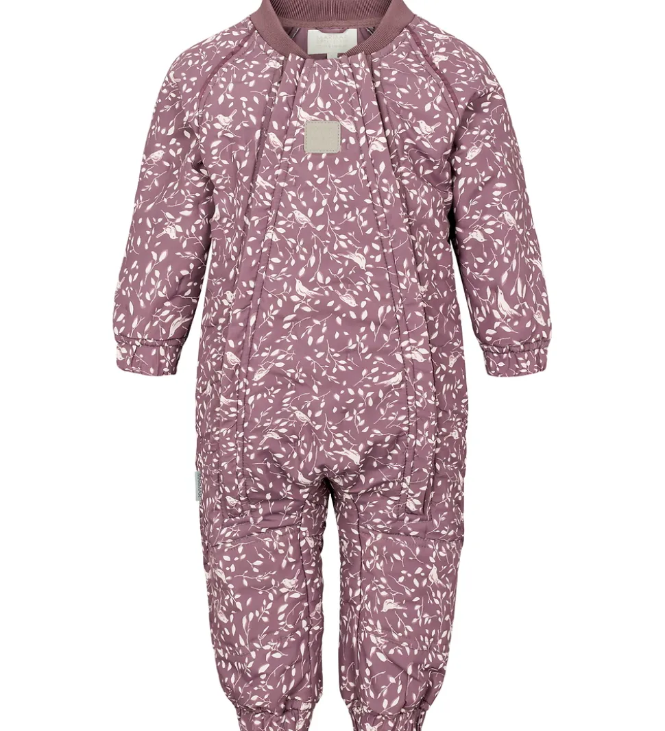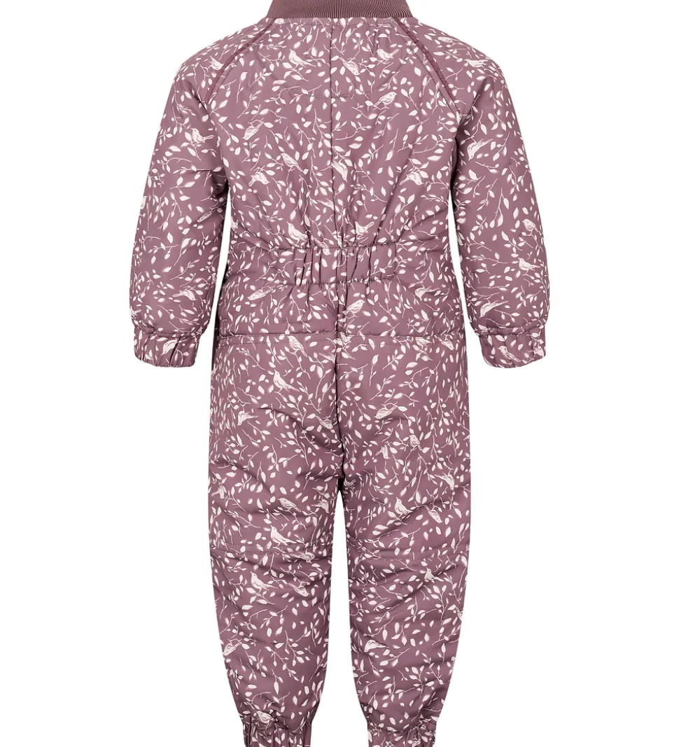 Sød MarMar termodragt i lilla med alloverprint i rosa med blade og fugle.