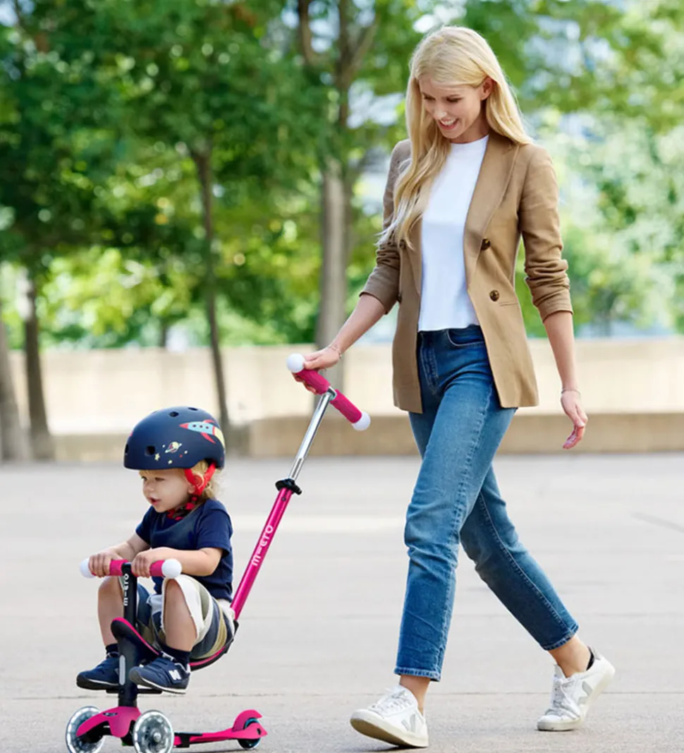 Micro løbehjulet har en praktisk multifunktion, da den også kan bruges som en løbecykel og bruges fra 12 måneders alderen og indtil 6 års alderen. Den kan bruges med sæde med mulighed for fodstøtte og skubbestang til forældrene, uden skubbestang og som et almindelig løbehjul.