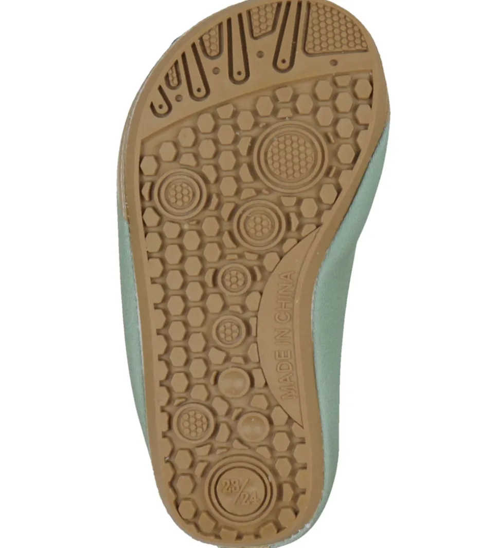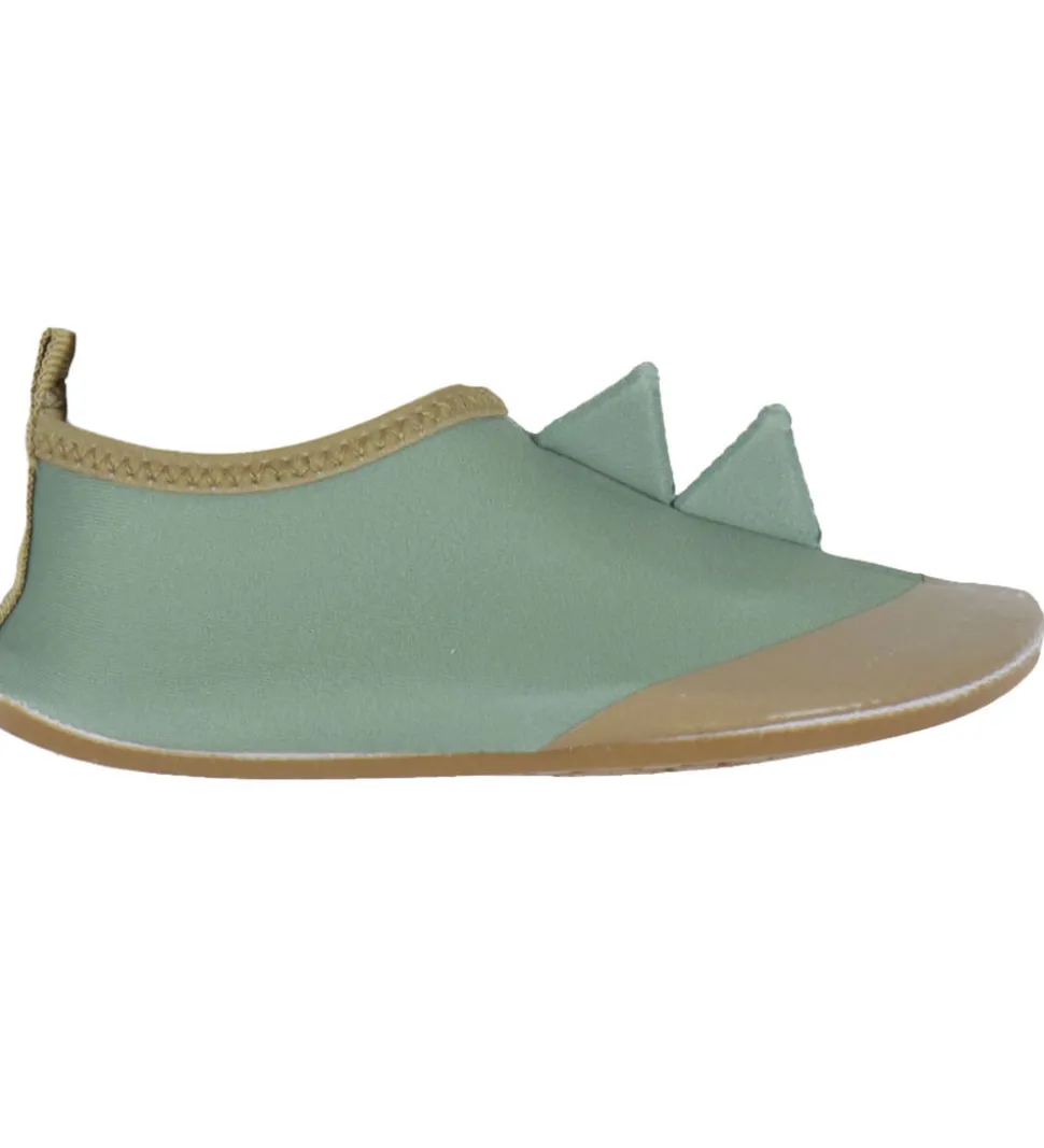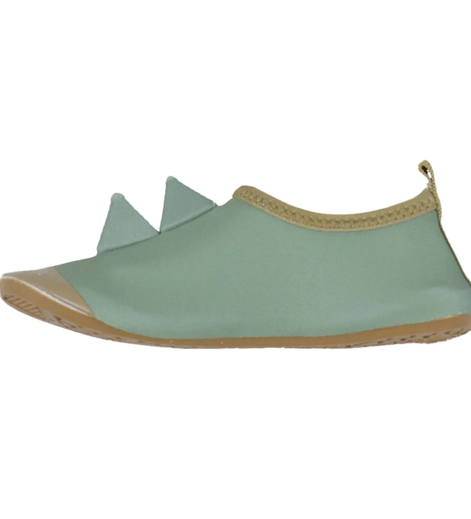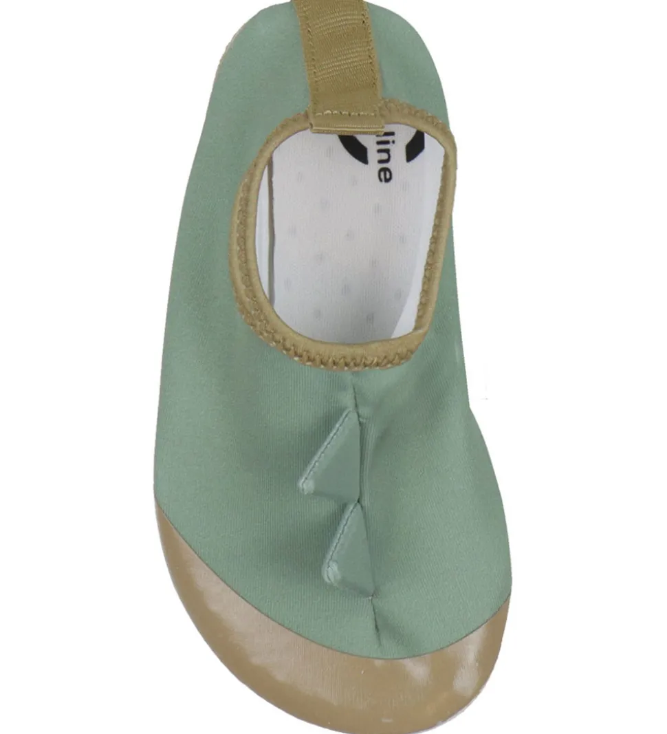Smarte Mikk-Line badesko i støvet grøn med to takker over vristen og brune detaljer.