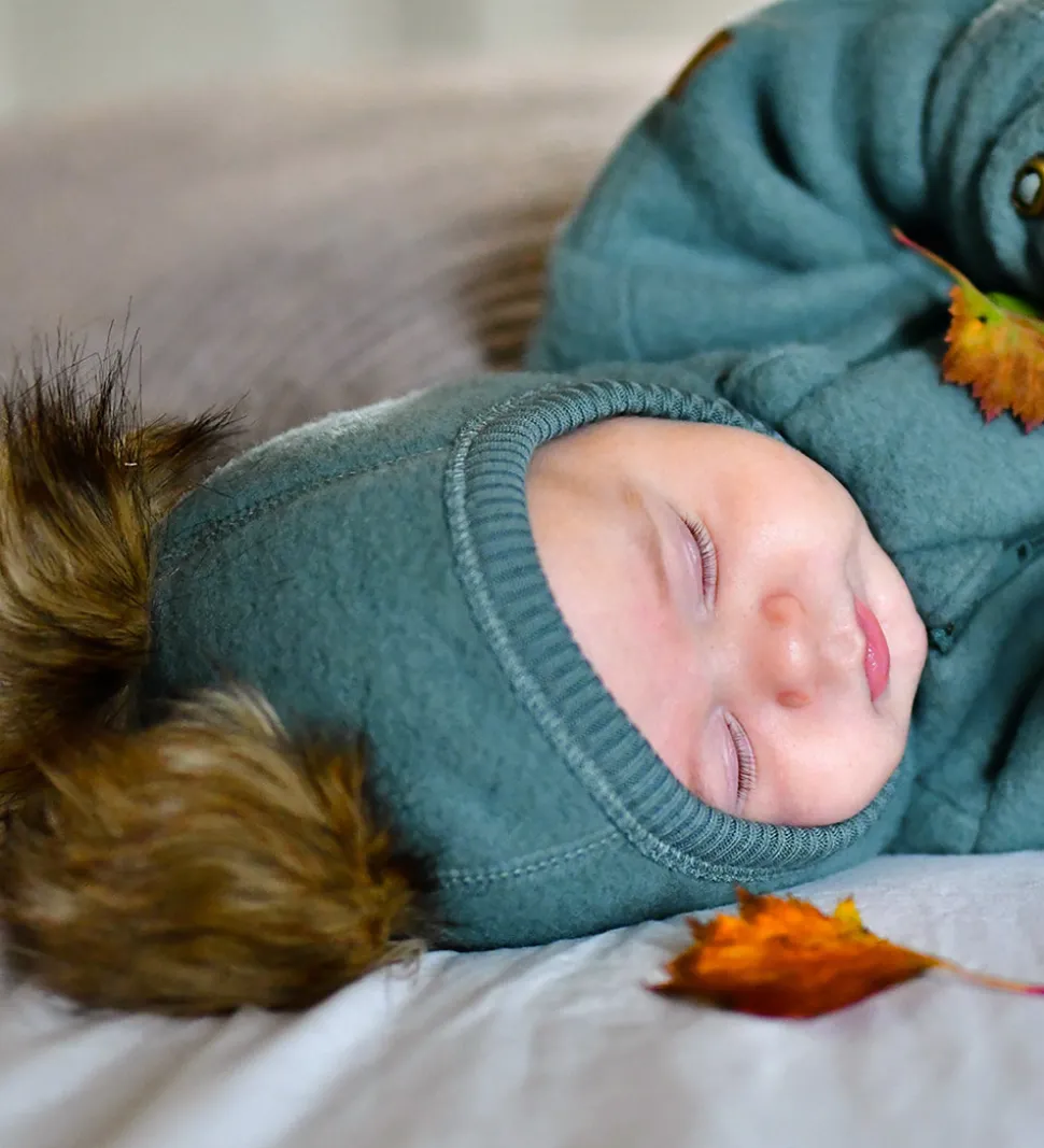 Pæn Mikk-Line elefanthue af filtet merinould i mørk, støvet grøn. Elefanthuen har nuttede, brune kvaste på toppen, som kan tages af ved hjælp af trykknapper. Under hagen er der et brunt lædermærke med et Mikk-Line-logo.