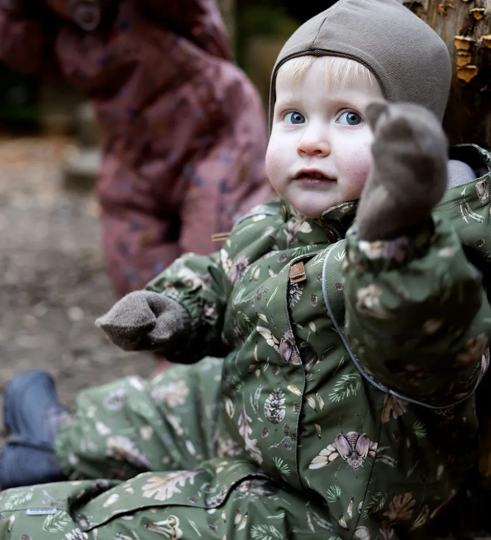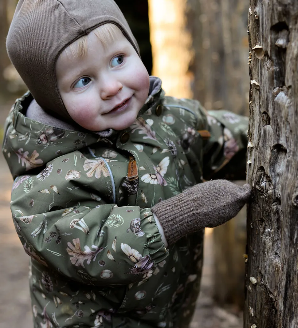 Fin Mikk-Line flyverdragt i mørkegrøn med et alloverskovprint med biller og blade i brune nuancer. Flyverdragten har praktiske refleksdetaljer langs skuldrene, på venstre ærme og langs oversiden af hætten.