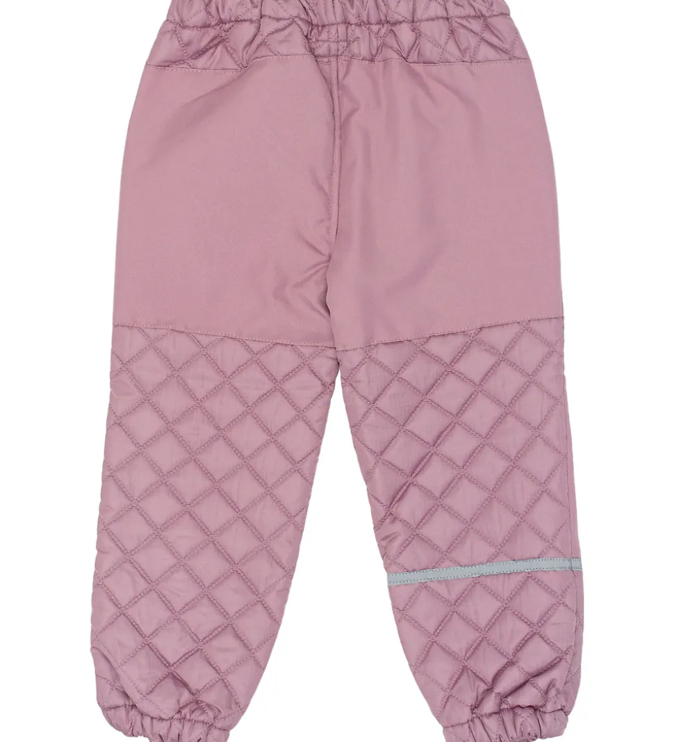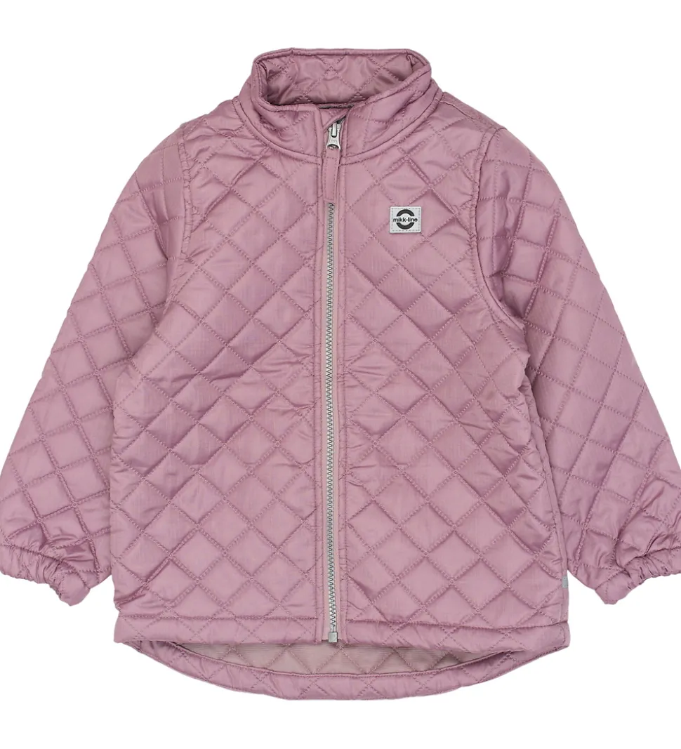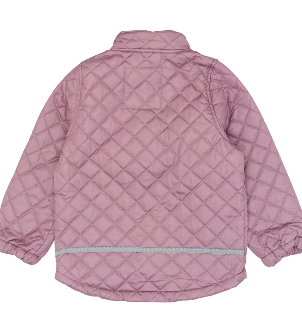 Fint Mikk-Line termotøj bestående af en termojakke og et par termobukser i rosa med en quiltet struktur samt velplacerede refleksdetaljer og -logoer.