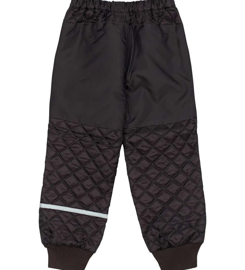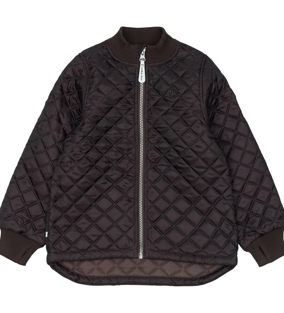 Fint Mikk-Line termotøj bestående af en termojakke og et par termobukser i mørkebrun med et lilla skær og en quiltet struktur.