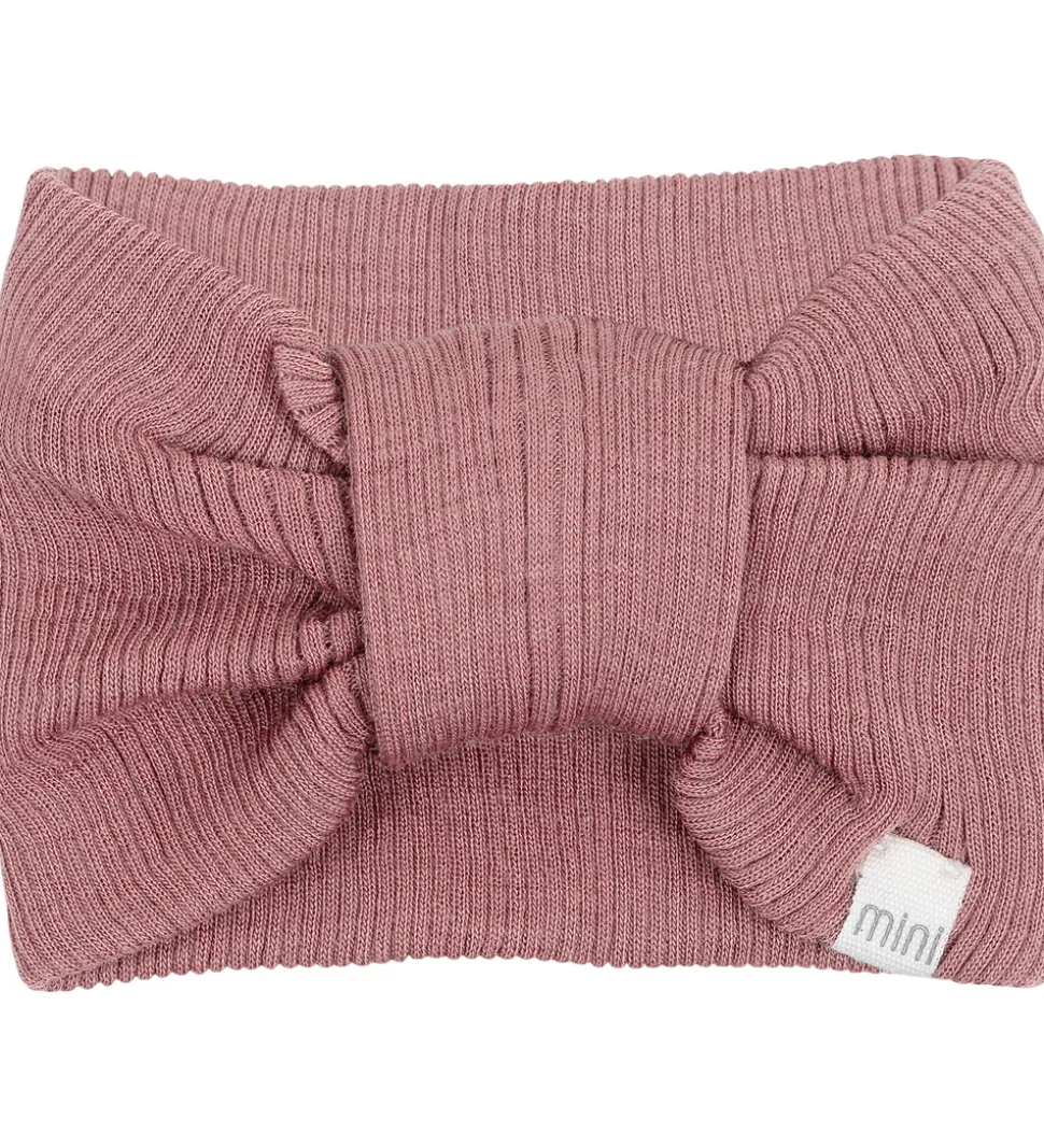 Sødt Minimalisma pandebånd i rosa med ribstruktur, og det er lavet af blødt merinould. Minimalisma pandebåndet er bredt og består af to lag, og fortil sidder der en dekorativ knude.