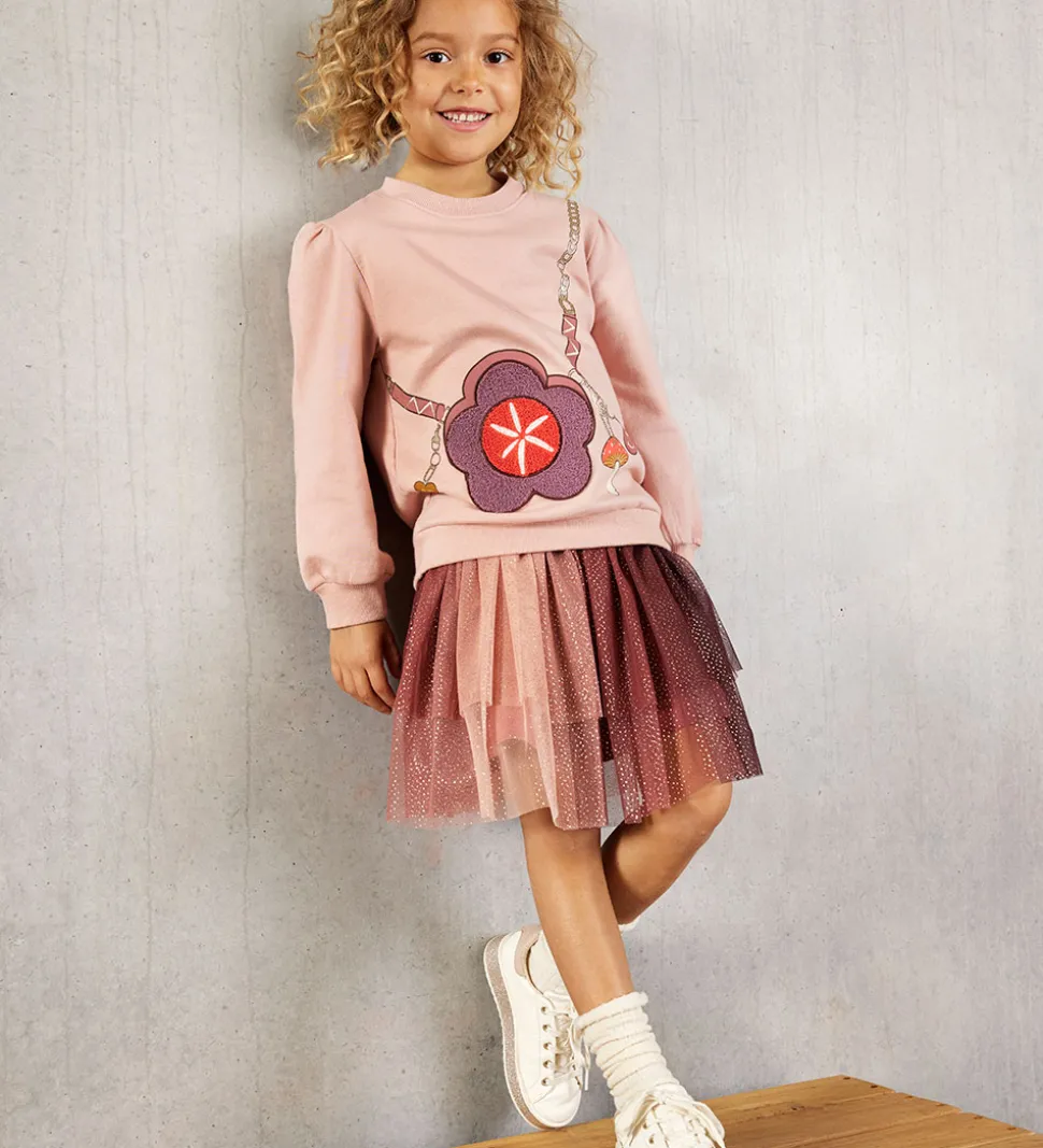 Flot Minymo tylnederdel i brune og rosa detaljer med guldglimmer, og i livet har den en bred elastikkant med glimmer. Minymo nederdelen består af to lag med to lag tyl yderst og et lag i kraftigt, gammelrosa bomuldsjersey på indersiden.