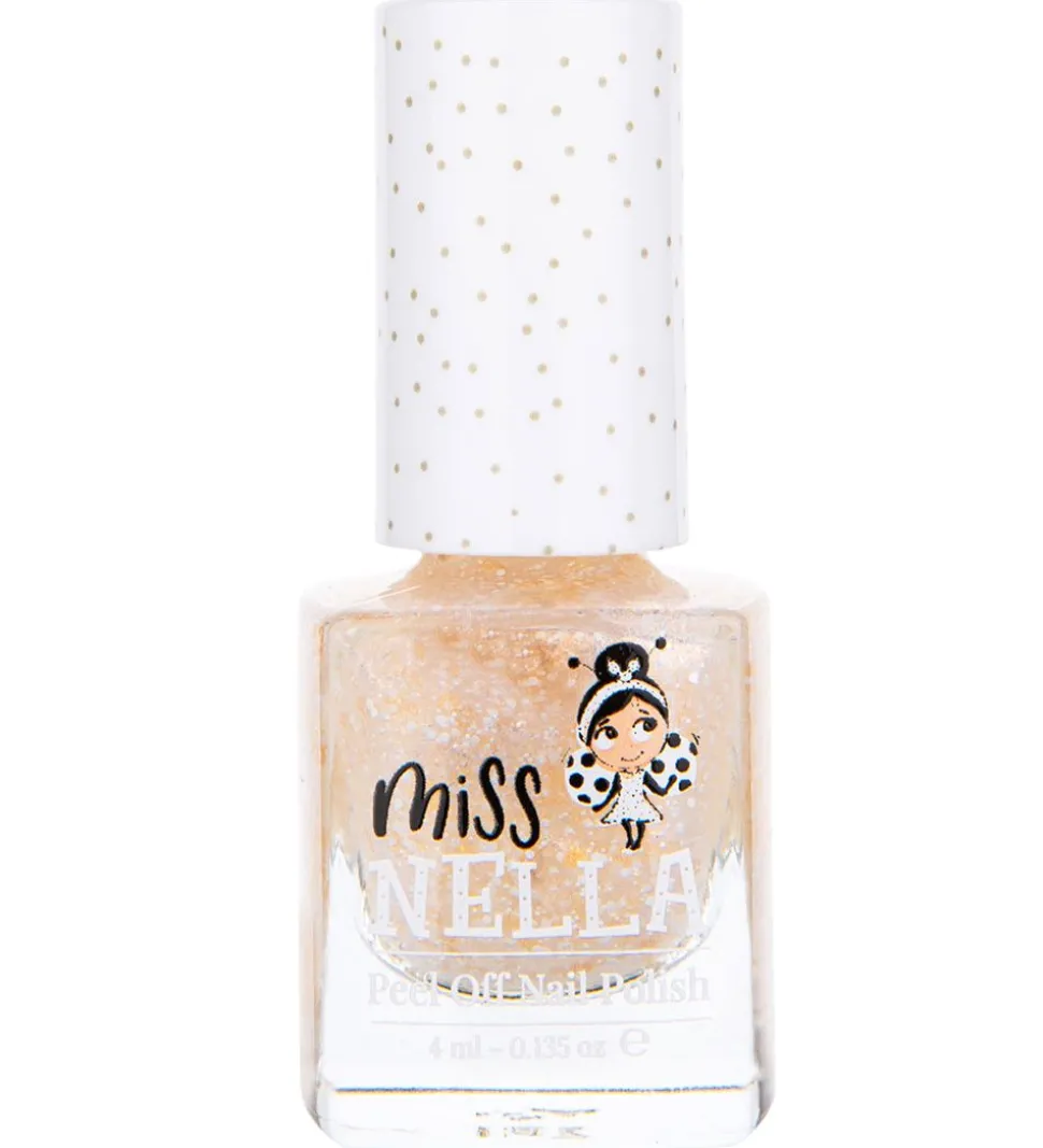 Flot Miss Nella neglelak med guld glimmer samt større stykker hvid glimmerstykker.