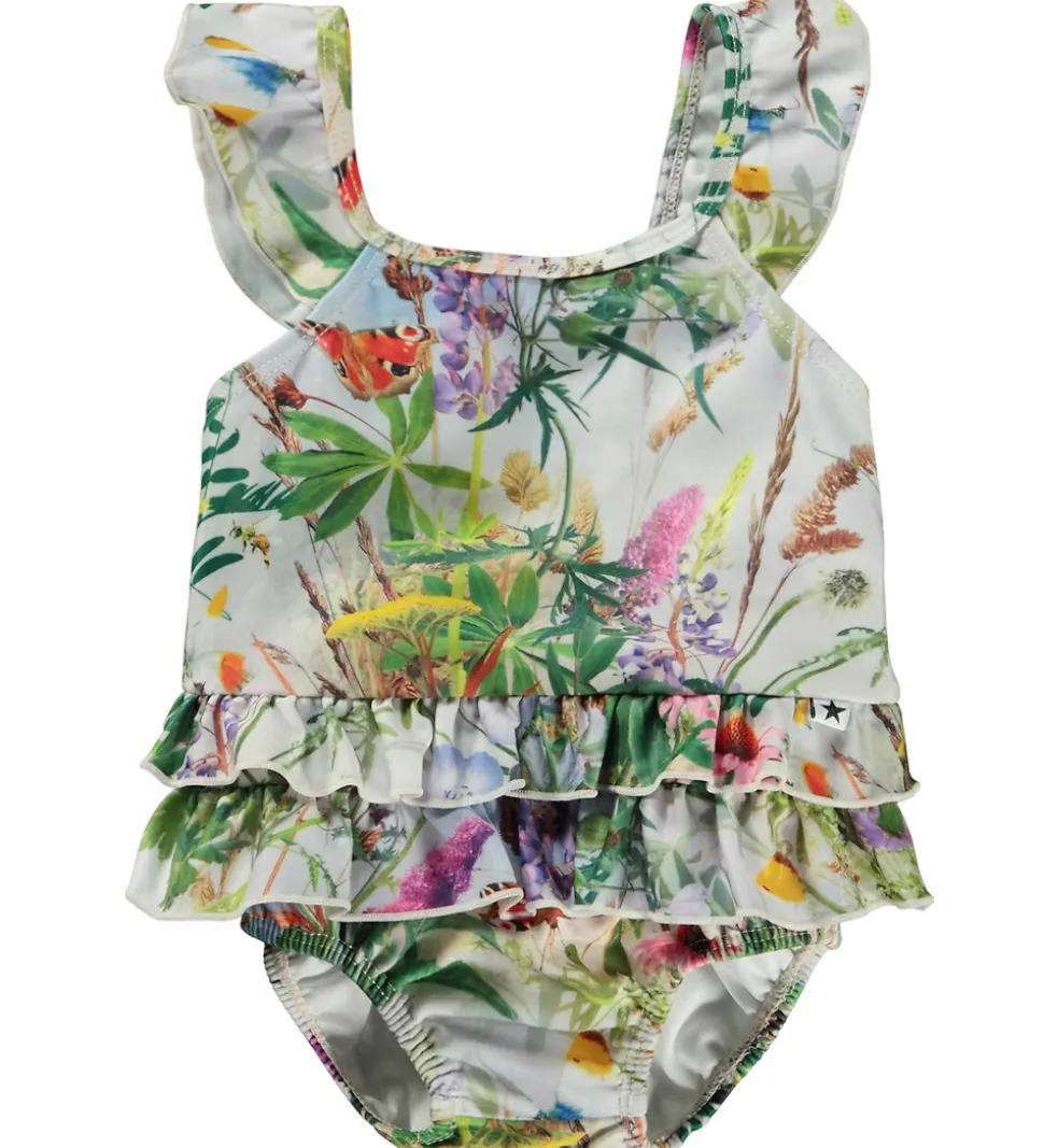 Smuk Molo badedragt med et farverigt blomsterprint. Badedragten har en rund halsudskæring og smalle skulderstropper med flæsedetaljer ved skuldrene. I taljen er der flæser og i benåbningerne er der elastik, som sikrer en god pasform.