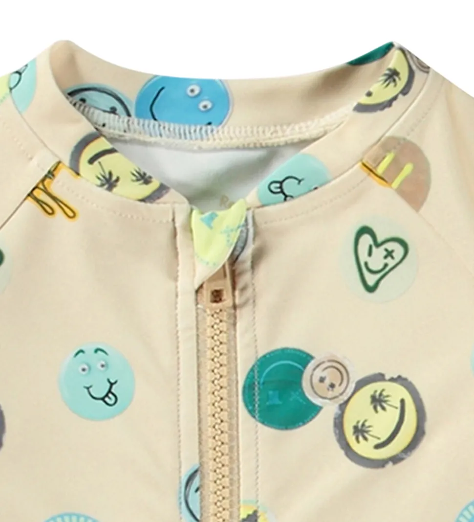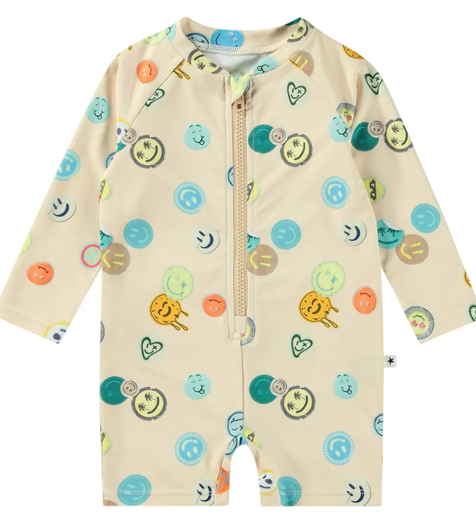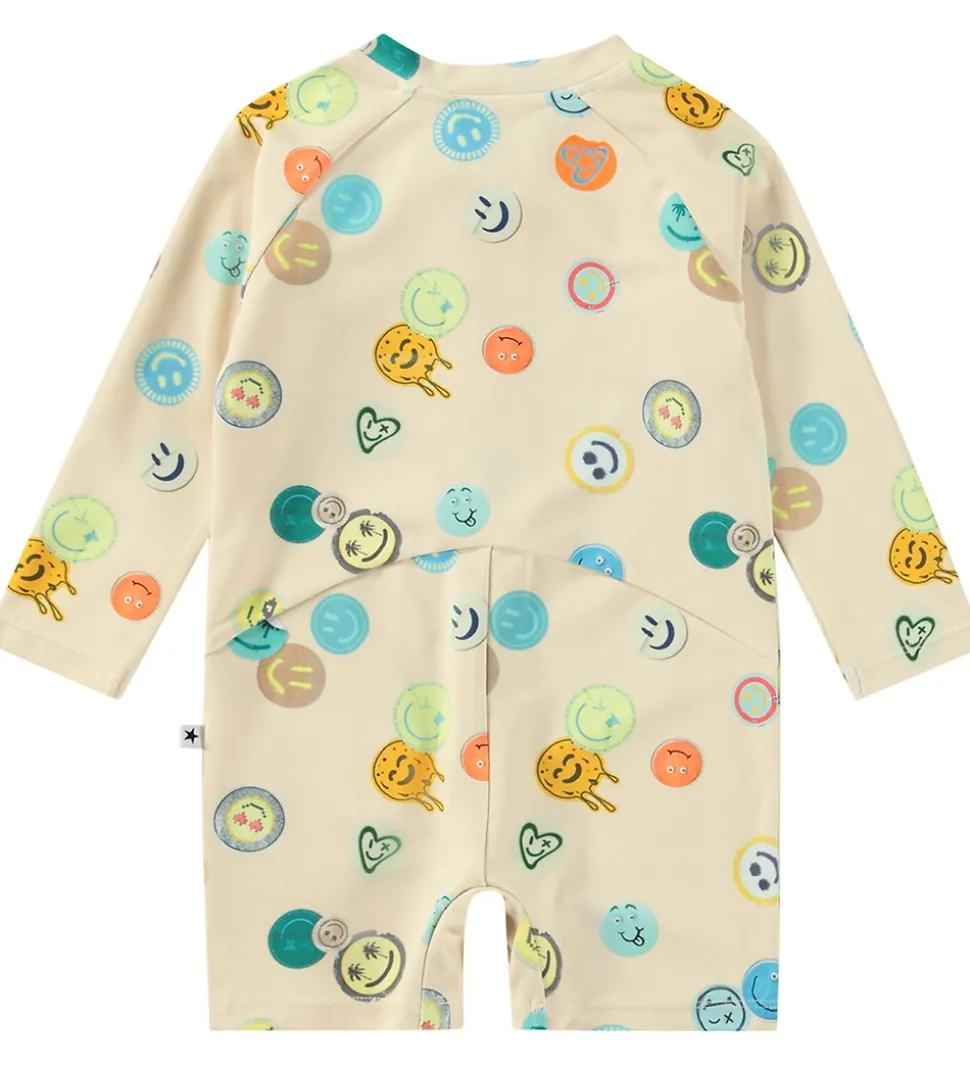 Smart Molo badeheldragt i beige med print af smileys i forskellige farver. Badeheldragten har en rund halsudskæring med en lynlås fortil med hagebskytter og indvendig vindstolpe. Badeheldragten har lange ærmer og korte ben.