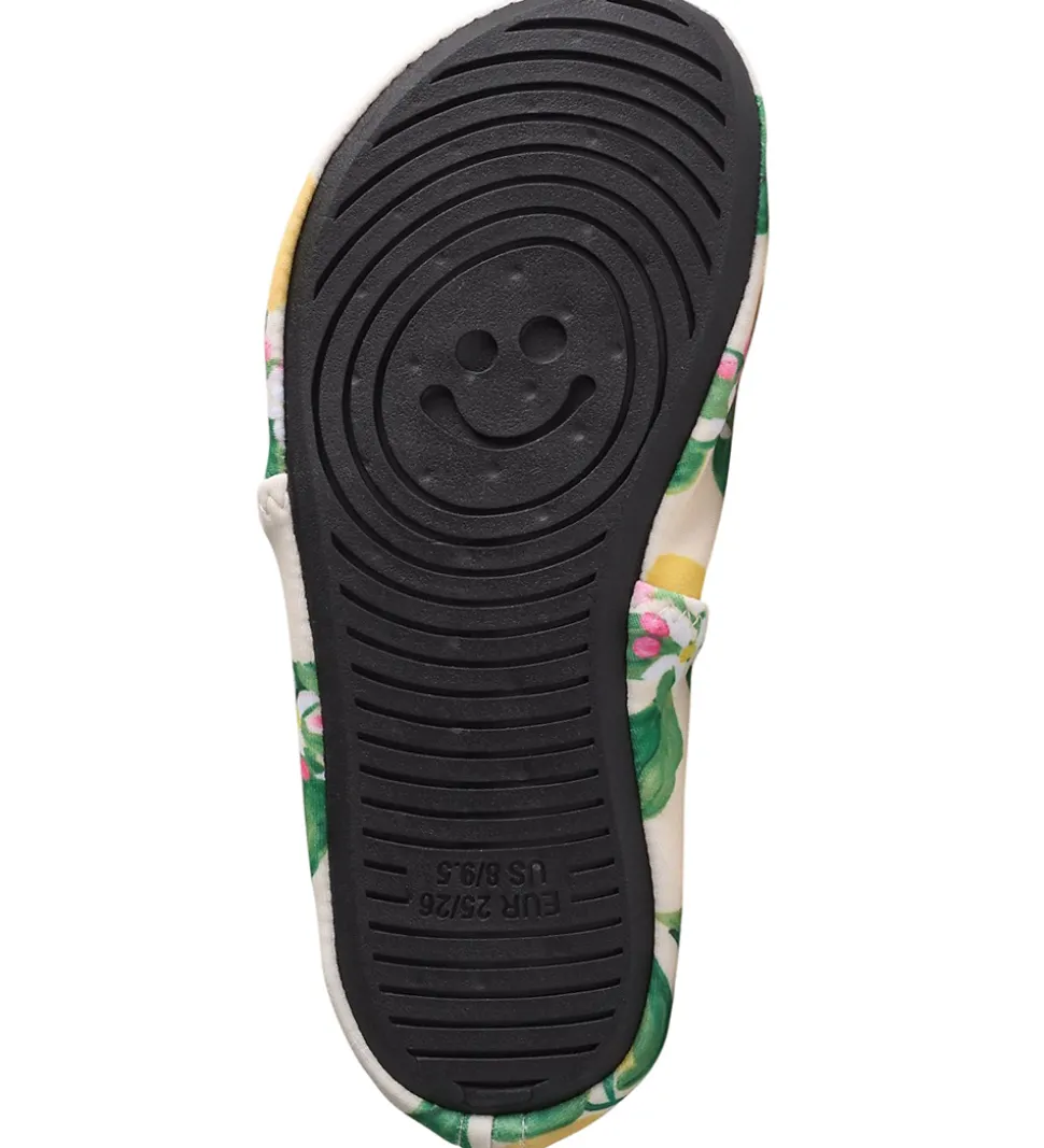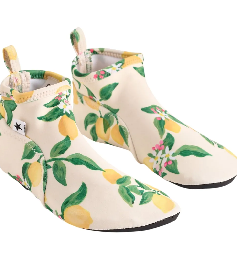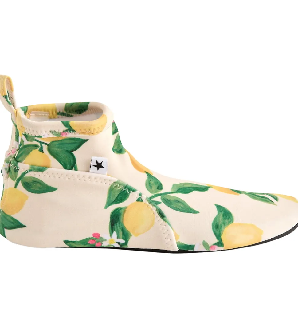 Friske Molo badesko i beige med et flot print af gule citroner og grønne blade. Molo badeskoene er lavet i et blødt og elastisk materiale, som giver en god pasform. Bagpå er der en praktisk strop, der gør det nemt at tage badeskoene af og på.