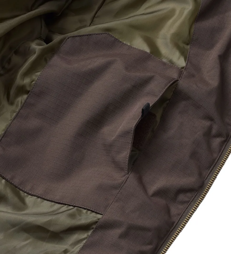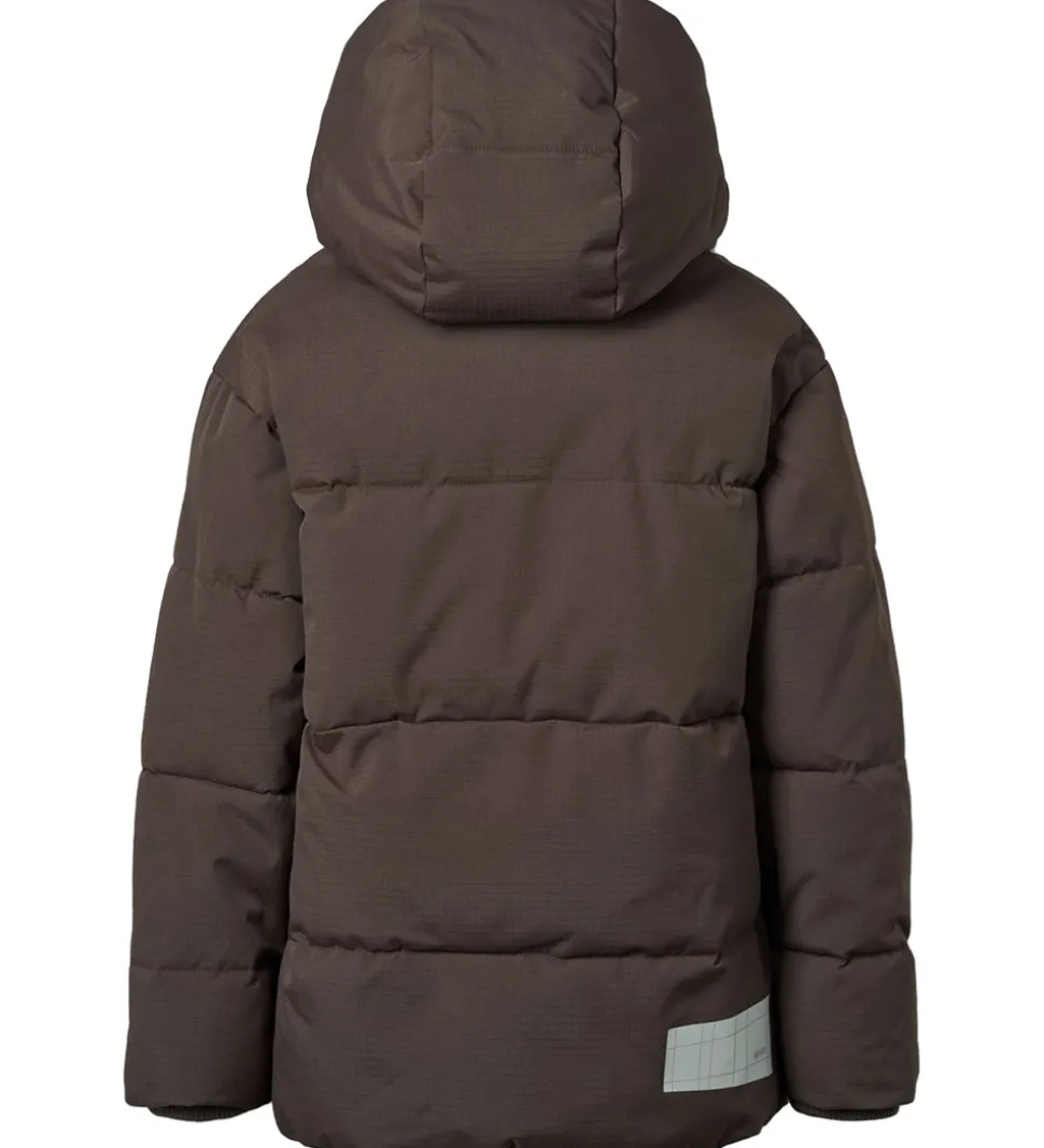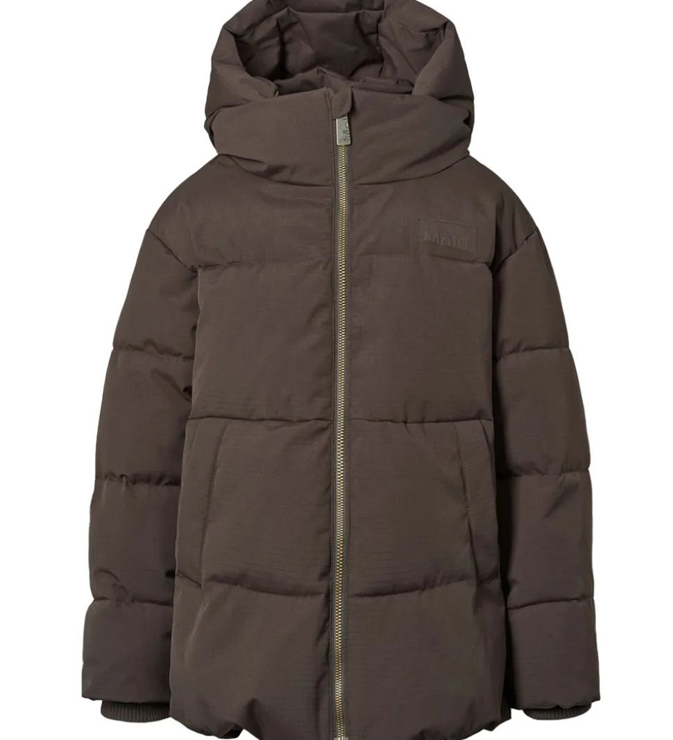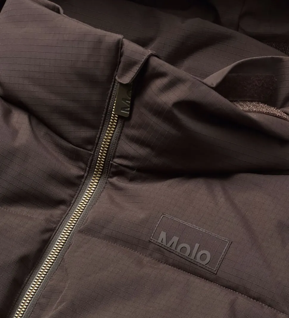 Smart Molo dynejakke i mørkebrun. Dynejakken har vandrette syninger og en diskret indvævet struktur i stoffet samt et logo på venstre bryst. Nederst på ryggen er der en logorefleks.