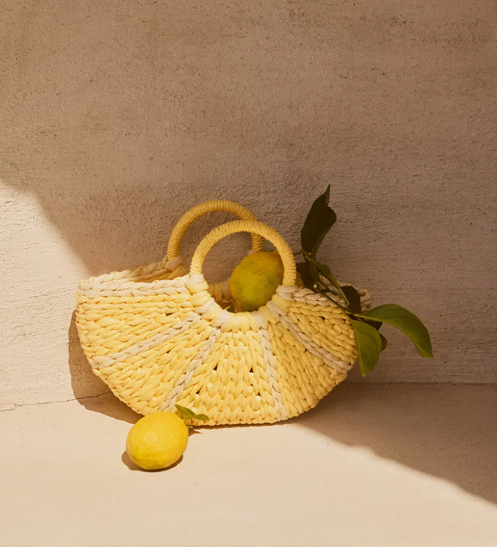 Elegant Molo taske i en lysegul nuance med beige striber. Molo tasken har et smukt flettet design, perfekt til at holde styr på dine ting. Praktisk og stilfuld til enhver lejlighed.