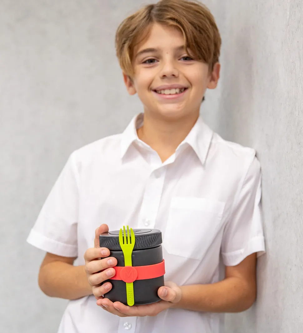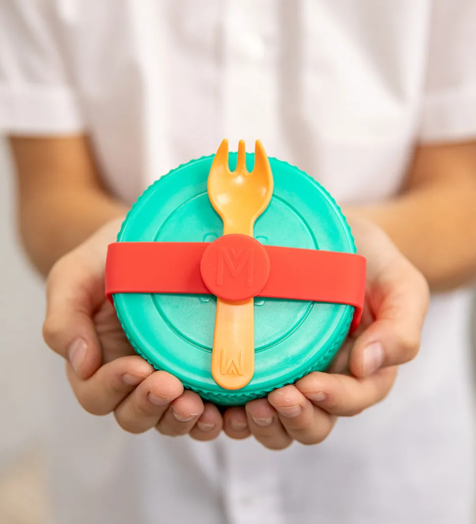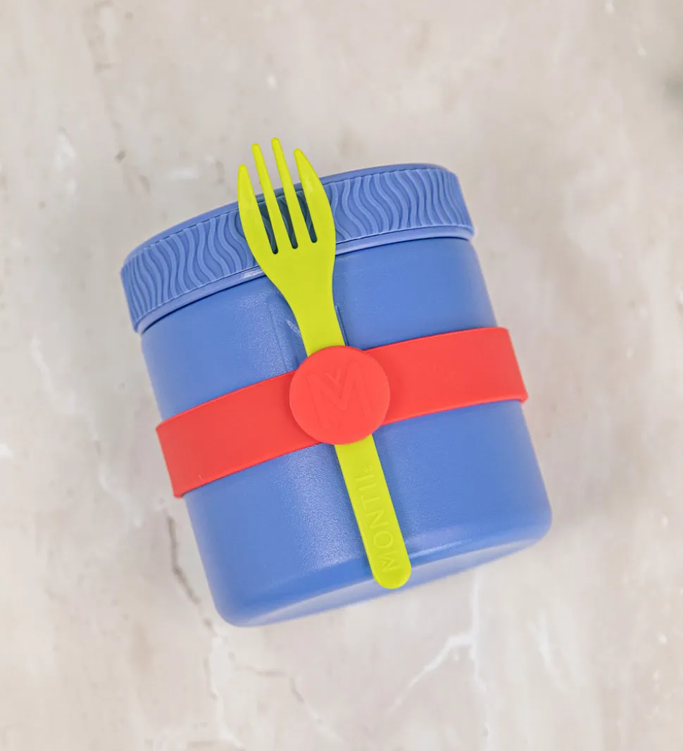 MontiiCo bestikbåndet er i blødt, fleksibelt silikone og spændes nemt omkring MontiiCo termobeholdere og Bento Two snackbokse for at fastgøre bestik fra MontiiCo Out and About-serien og MontiiCo spork-sæt.