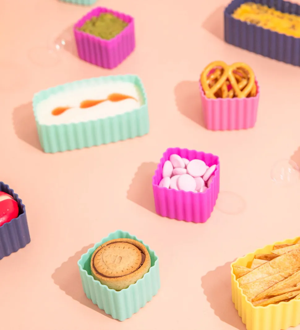 MontiiCo silikoneindsatserne kommer i en aflang og to kvadratiske, og de passer til Bento-madkasserne fra MontiiCo. Indsatserne kan inddele madkassen i endnu flere rum, og de gør det let at håndtere små portioner af snacks.