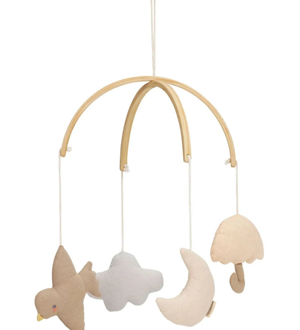 Fin Moonboon Uro med en sky, en måne, en fulg og en paraply i beige nuancer.