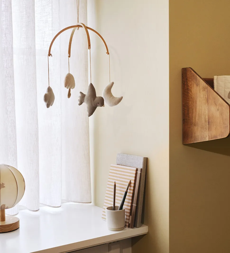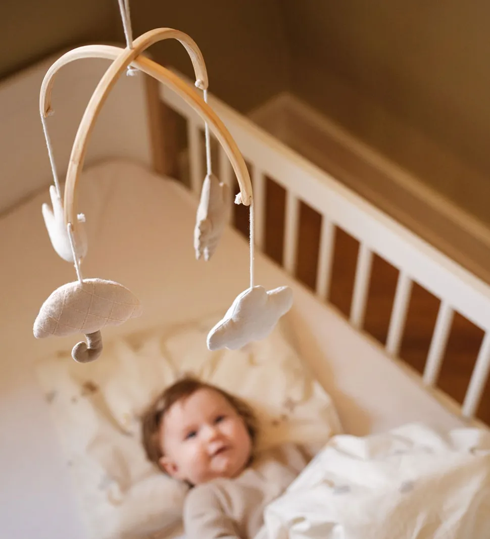 Moonboon uroen har tynde halvringe af træ, hvor alle motiverne sidder fast med en tynd snor, så det ser ud som om at de svæver i luften. Uroen er med til at skabe en rolig og hyggelig atmosfære når barnet skal sove.