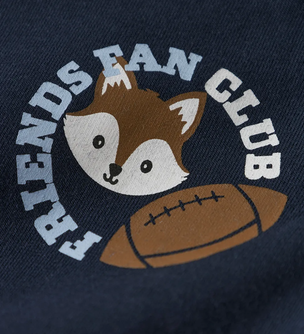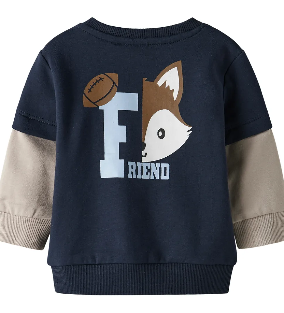 Smart Name It sweatshirt i navyblå med print af en ræv og en amerikansk fodbld med teksten “Friends Fan Ckub” på venstre bryst. På ryggen er der et stort, lignende print. Sweatshirten er designet med ærmer i beige, så det ligner at man har en t-shirt udenover. Den har en rund halsudskæring med trykknapper ved venstre skulder og lange ærmer med ribkanter. Indvendigt er der blødt, børstet bomuld.