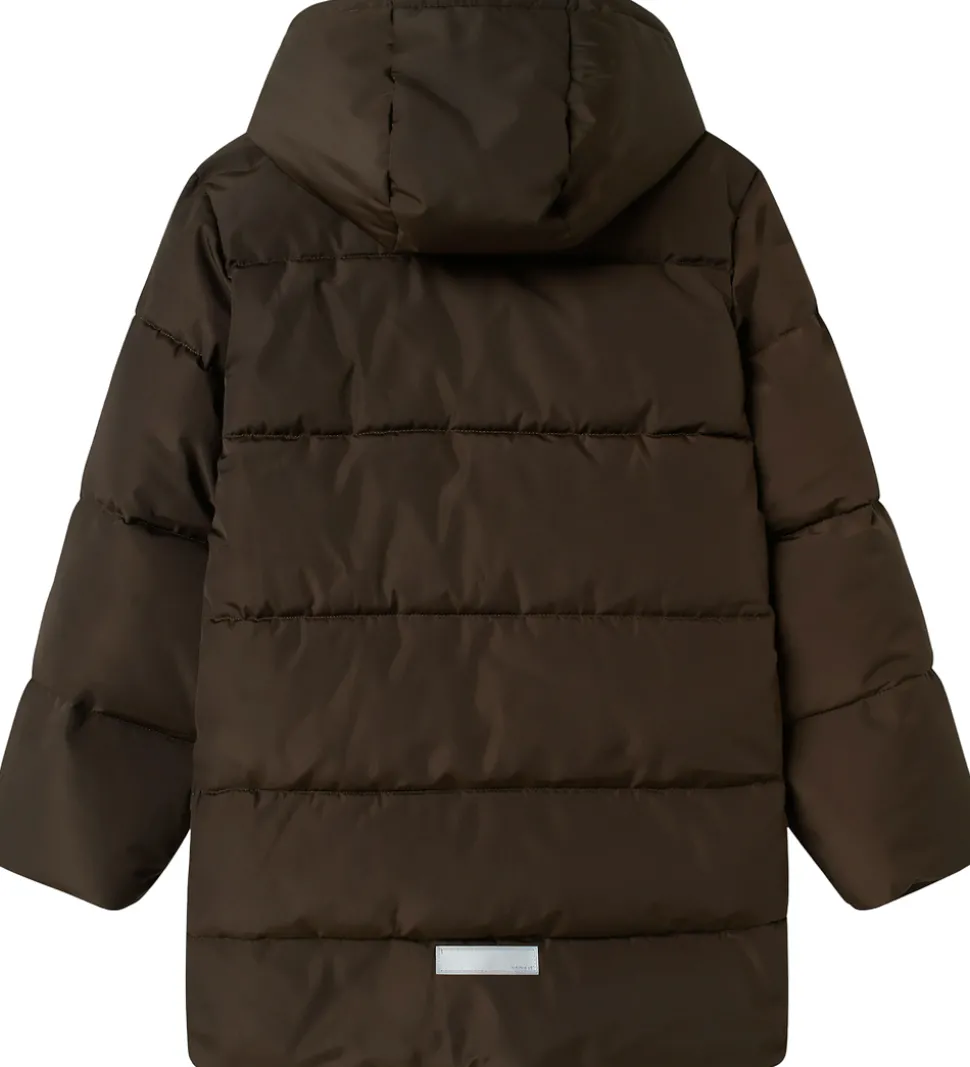 Flot Name It dynefrakke i ensfarvet mørkebrun og med vandrette syninger samt praktiske reflekser.