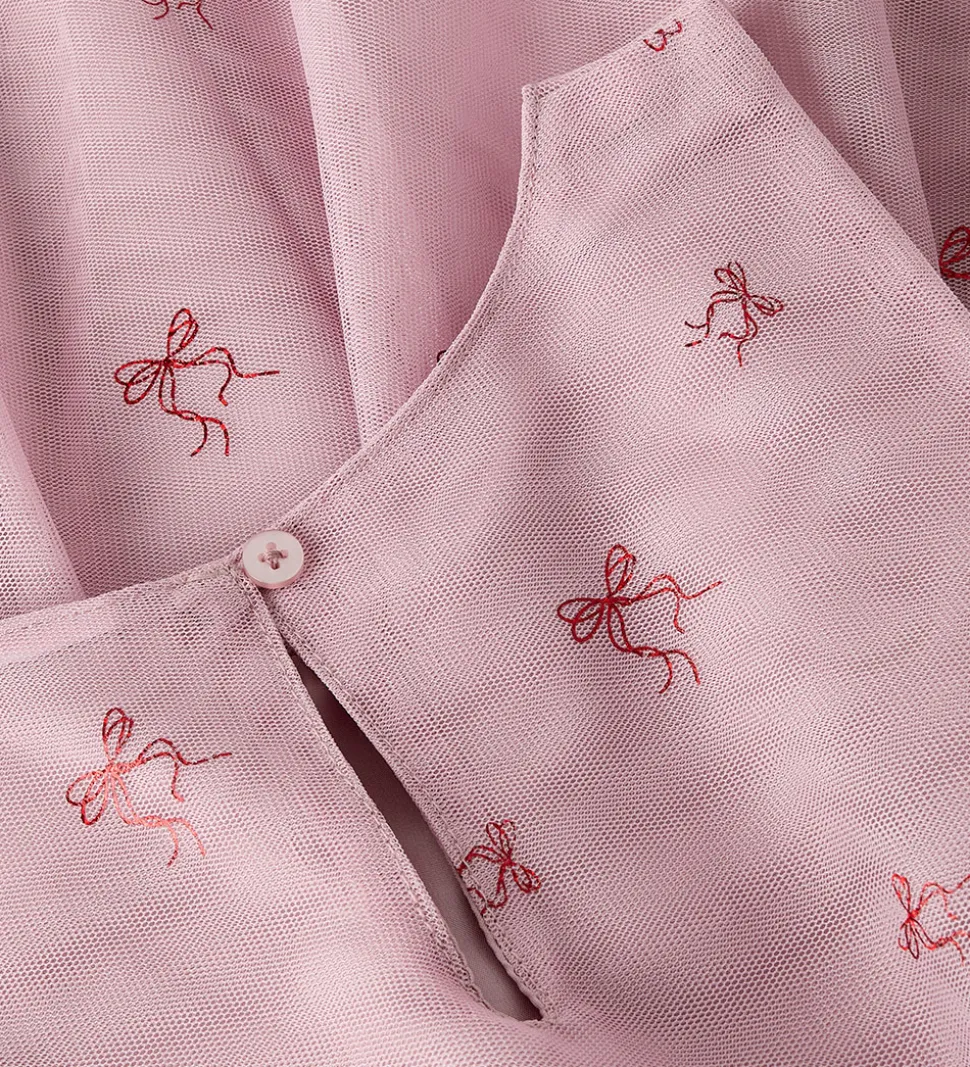 Elegant Name It kjole i rosa med et smukt mønster af små sløjfer i rød glimmer. Name It kjolen er ærmeløs og har en rund halsudskæring med en knap i nakken. Kjolen består af et lag polyester inderst og flere lag tyl yderst.