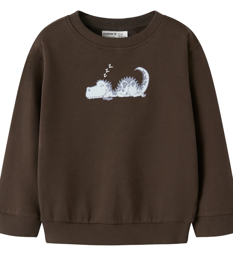 Skøn sweatshirt fra Name It i mørkebrun med et print af sovende dinosaur i lyseblå på brystet. Name It designet har lange ærmer og en rund halsudskæring. Indvendigt er der blødt, børstet bomuld.