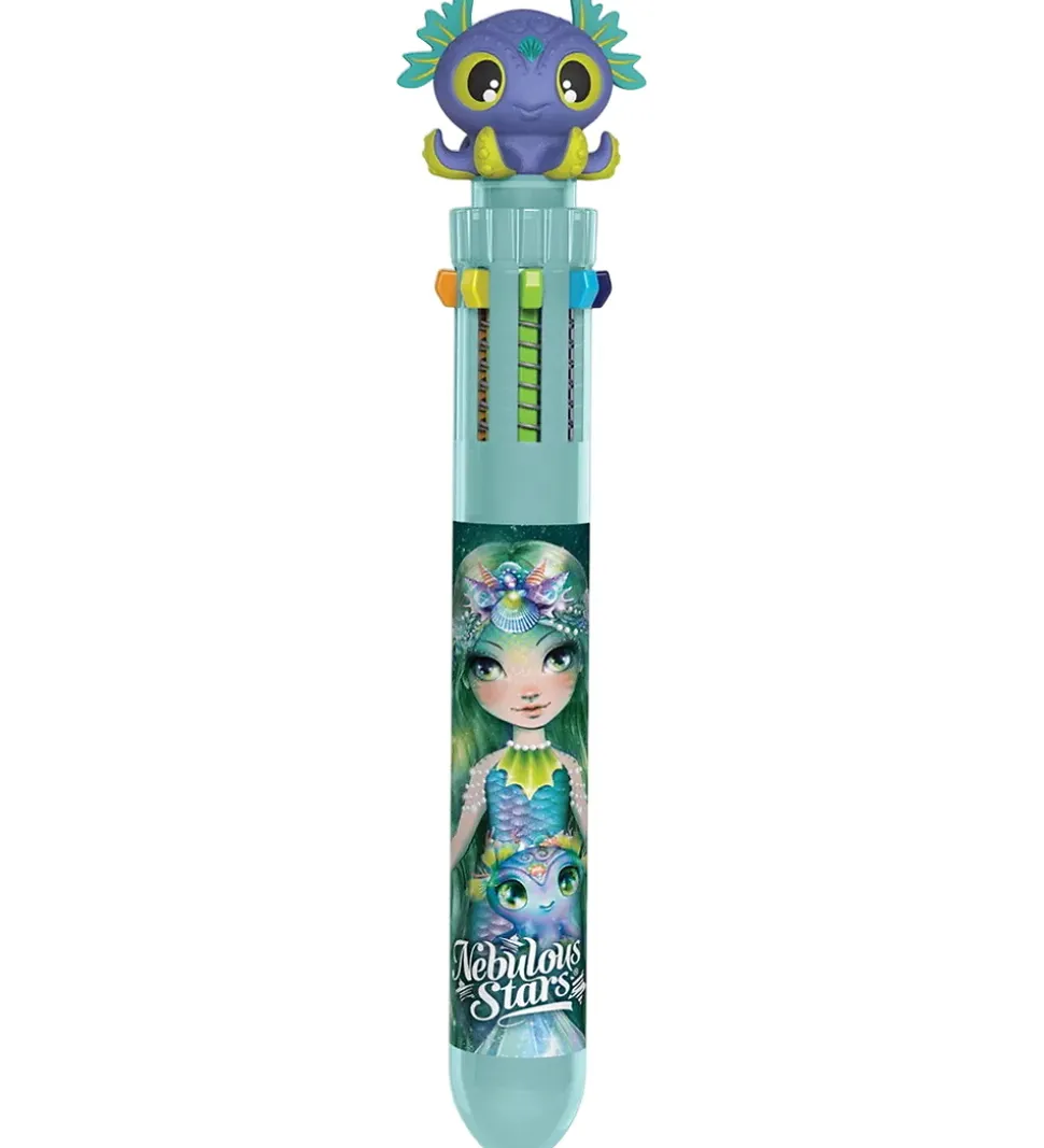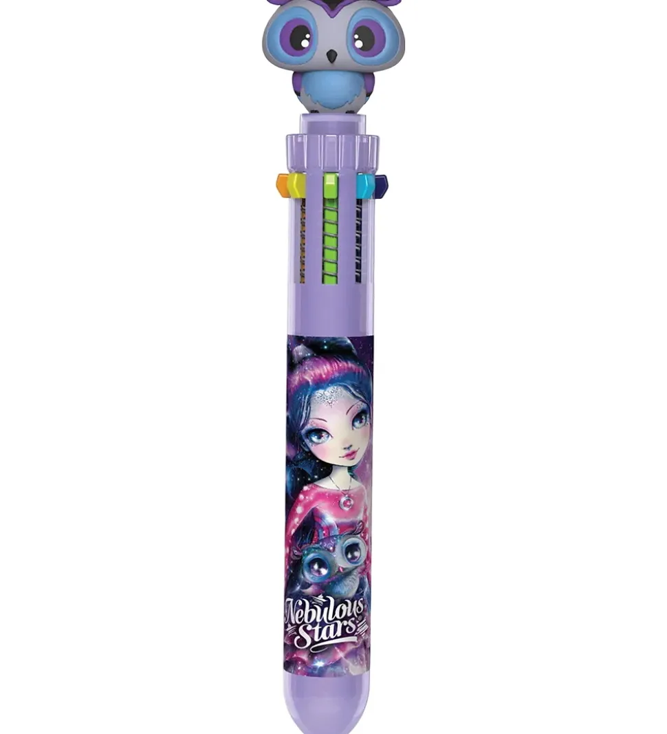 Nebulous Stars kuglepennen er et must-have for kreative børn. Den er både prydet med et flot motiv, og så er den tyk, så den ligger godt i hånden. Man kan vælge én af de 10 farver at skrive med, og når man vil skifte farve, trykker man blot ned på den søde ugle figur i toppen, hvorefter farven vil springe op igen så man kan vælge en ny.