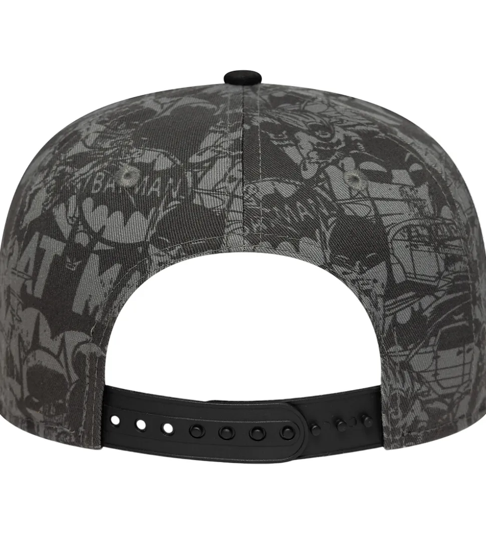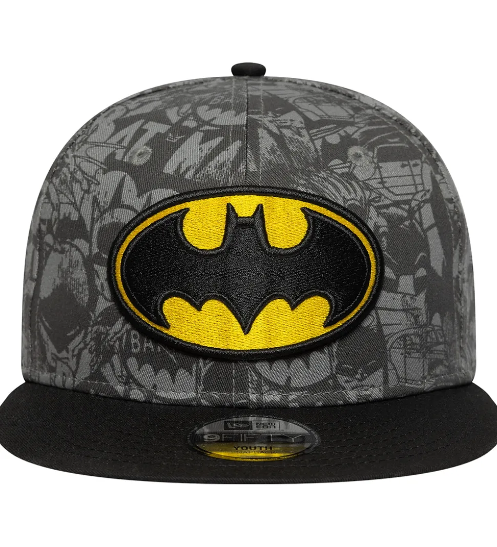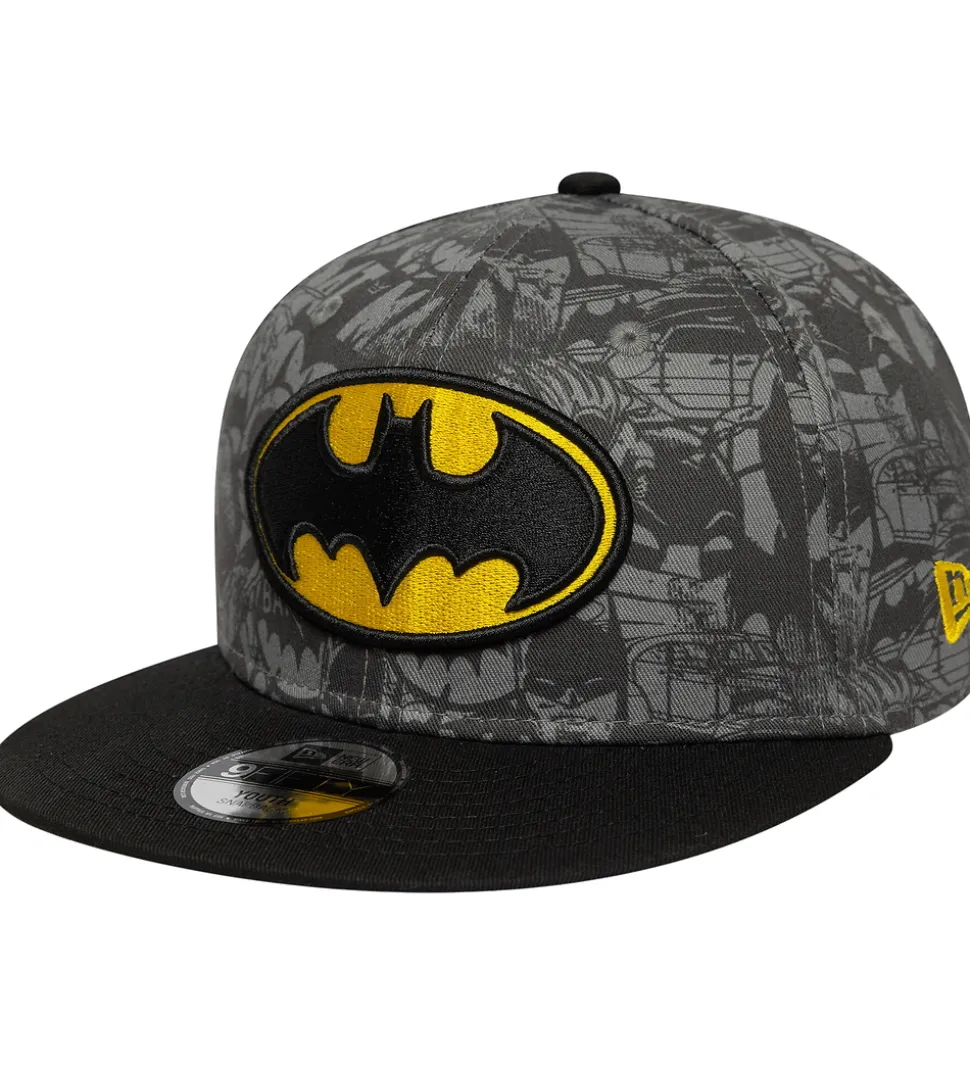 Flot New Era kasket med et gråt mønster og et markant gult og sort Batman-logo på fronten.