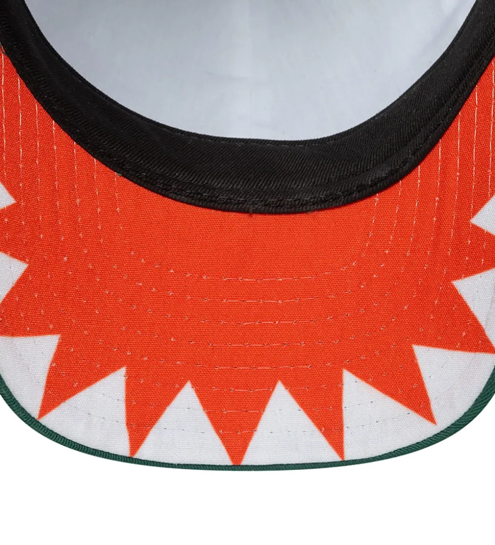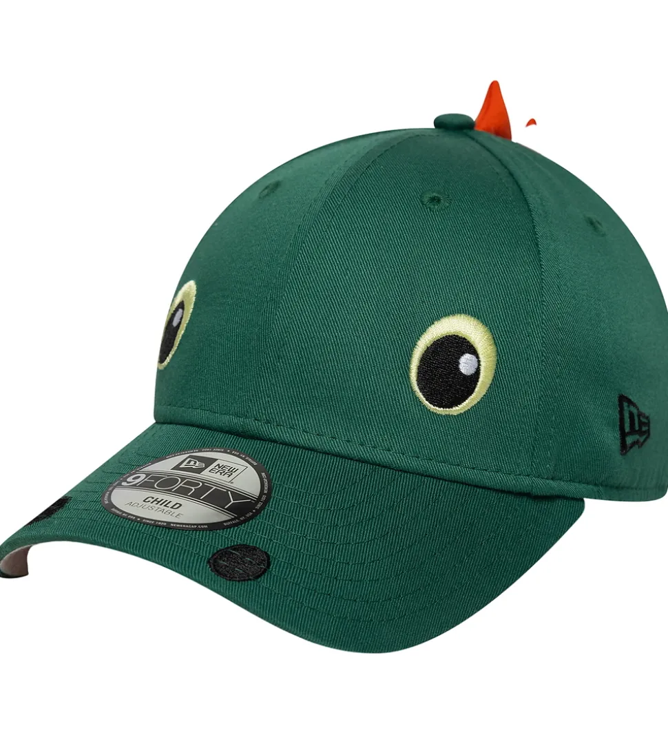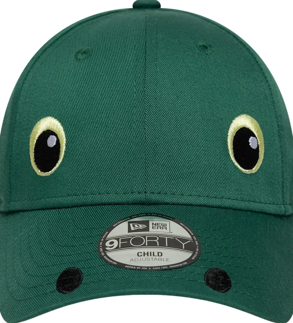 Charmerende New Era kasket i grøn med broderede øjne på fronten og små, røde detaljer på toppen, der minder om en dinosaur.