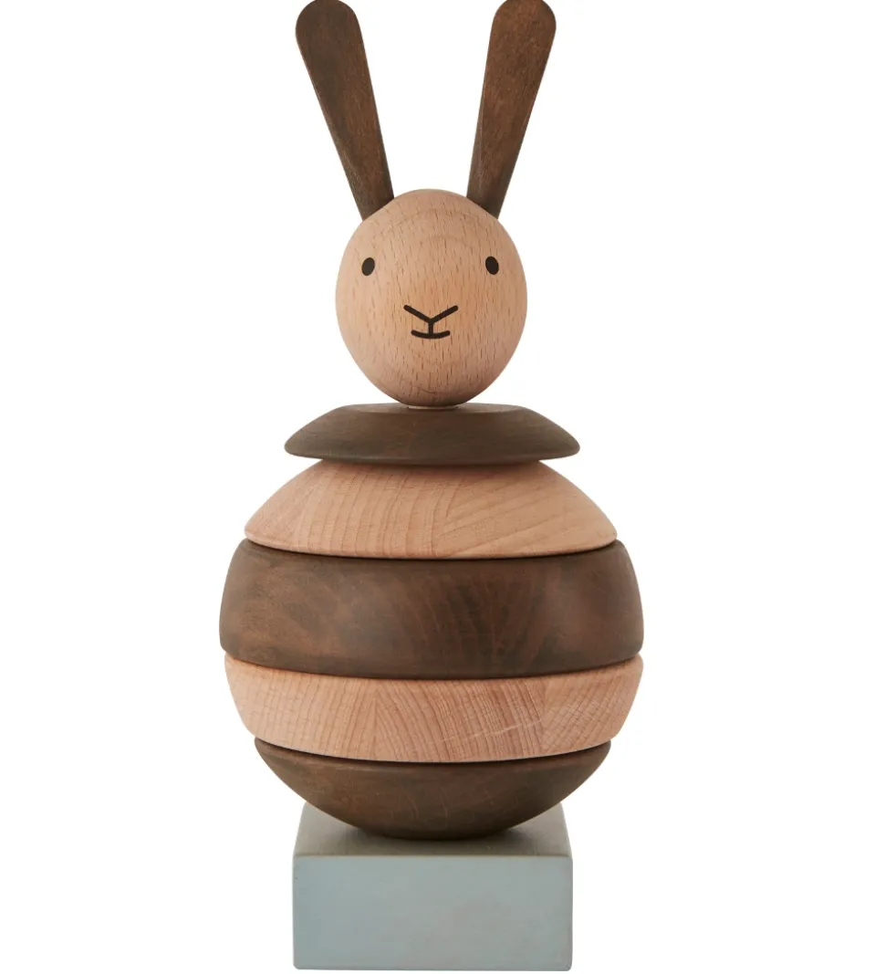 OYOY stabletårnet består af i alt syv dele, med forskellige former. Den nederste del har en lang træpind i midten, som kaninen kan stå på. Stabletårnet er sjovt og lærerigt for de små, da det styrker barnets motorik og logiske sans.