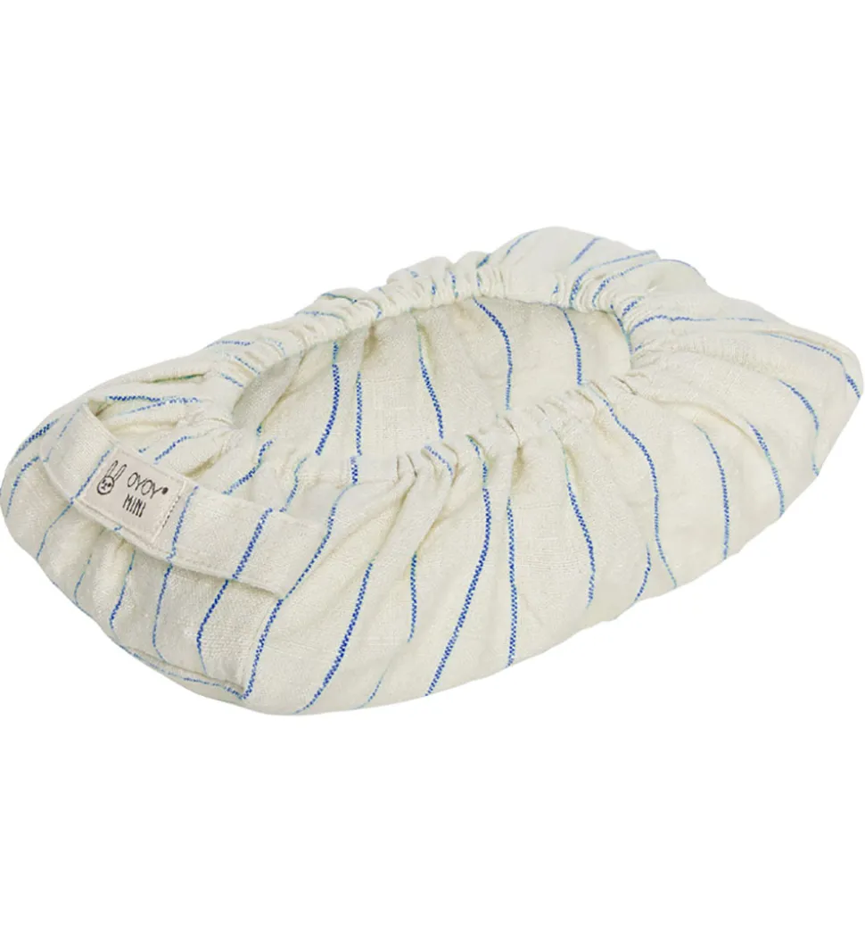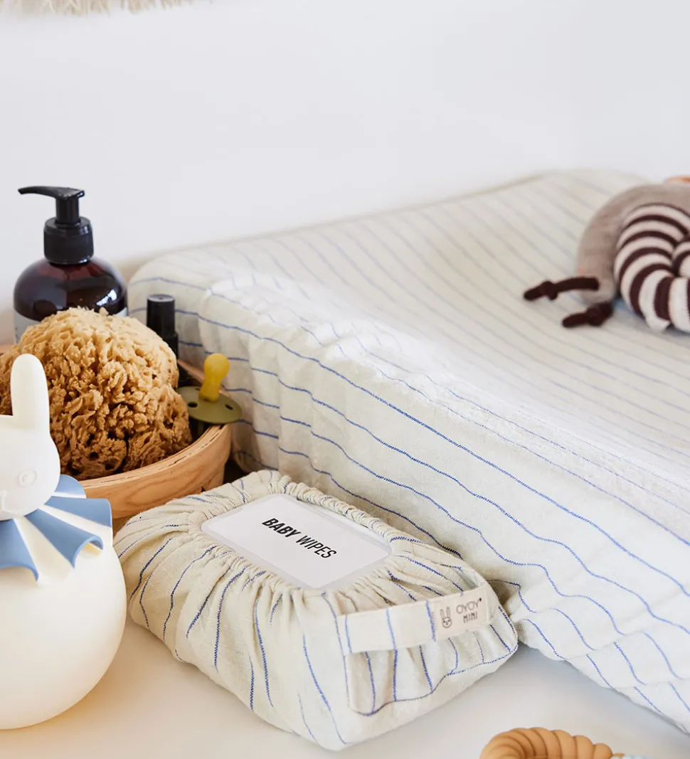 Fin OYOY vådserviet etui i cremehvid med smalle striber i blå.