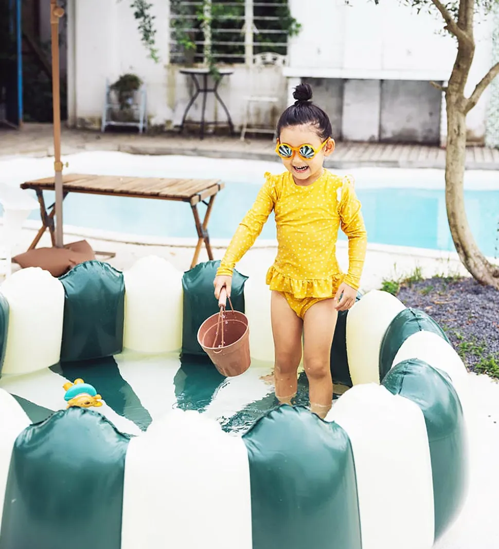 Petites Pommes badebassinet har en rund udformning med en bølget kant. Badebassinet er perfekt til de små, som stadig er igang med at lære at svømme, eller bare har brug for at køle ned i det varme vejr. Badebassinet er oppusteligt, og der medfølger et praktisk lappesæt i tilfælde af punktering.