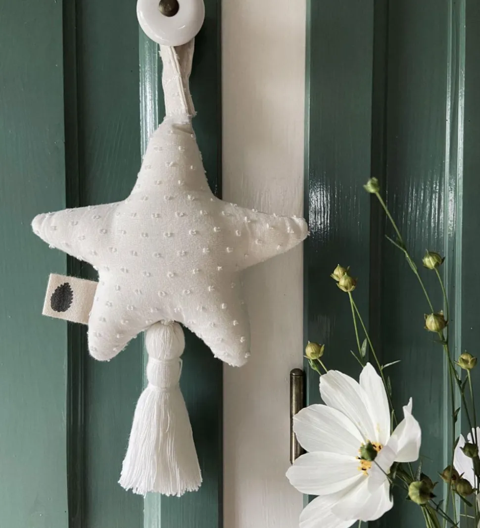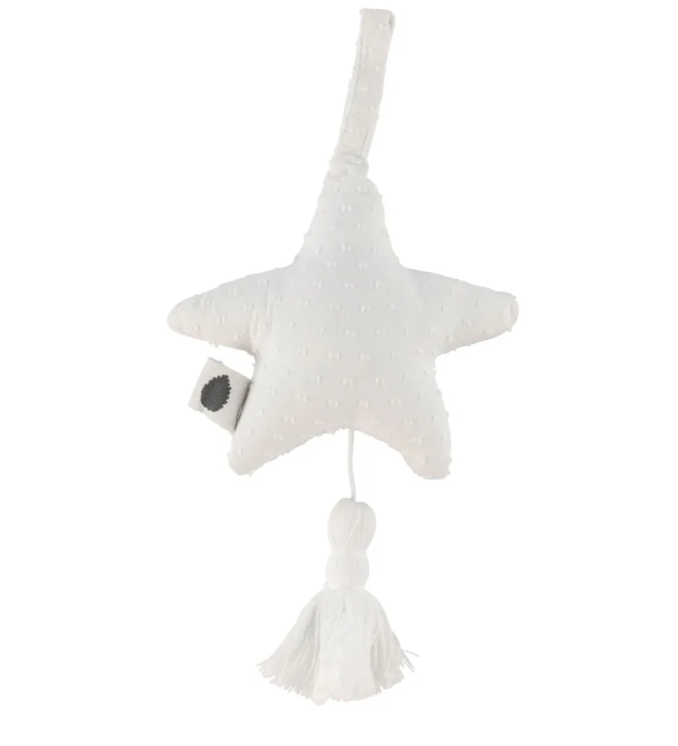 Yndig Pine Cone musikuro i hvid med hvide prikker. Musikuroen har form som en stjerne.
