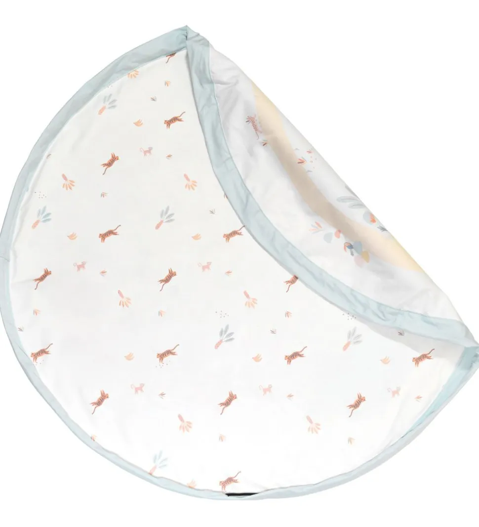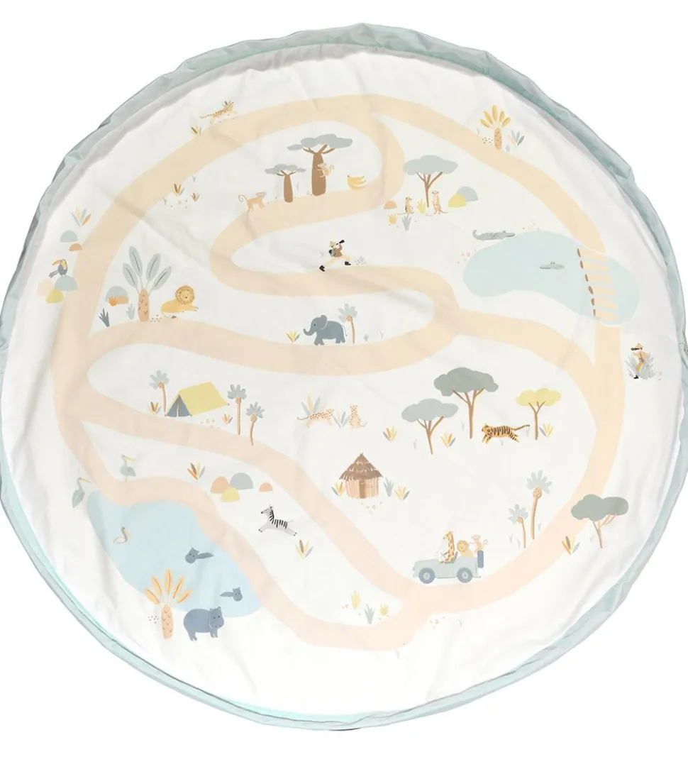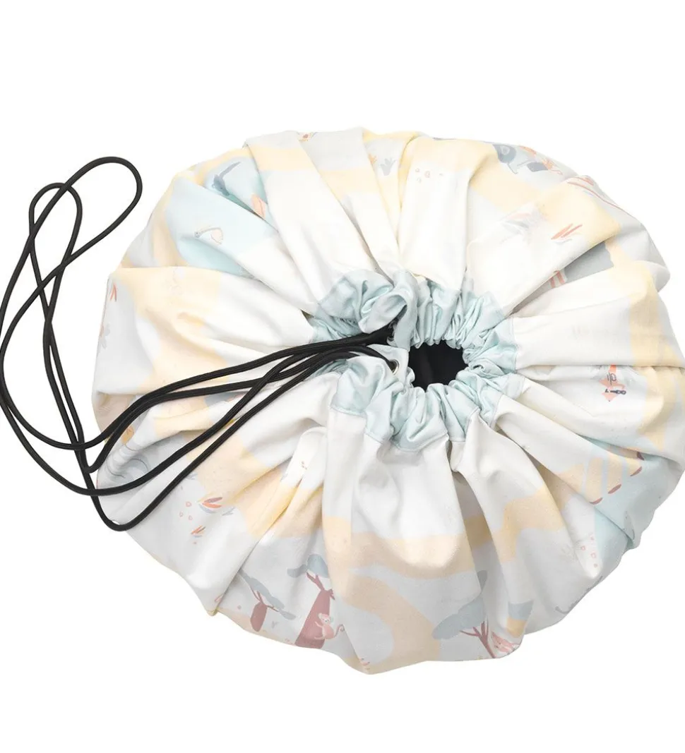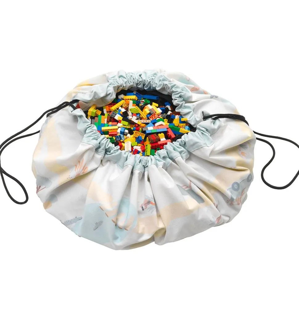 Play&Go legetøjstæppet er et stort cirkelformet stykke stof med en løbegang hele vejen rundt med en sort snor, så man kan snøre tæppet sammen til en pose. I posen kan man opbevare sit legetøj, og når børnene synes, at legetøjet skal med ind i stuen, kan posen åbnes og legetæppet folder sig ud. Bagefter er det hurtigt og nemt at rydde op og lægge på plads.