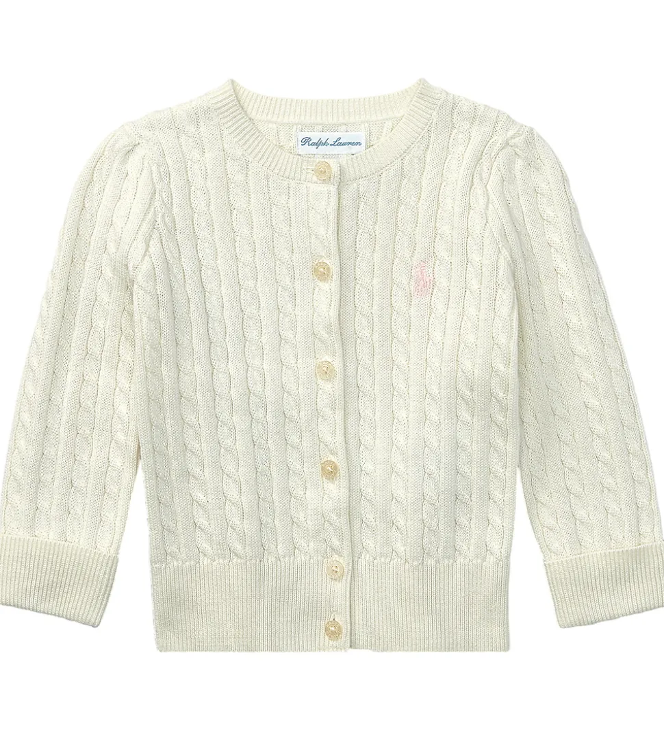 Stilfuld Polo Ralph Lauren cardigan i hvid med en klassisk kabelstrik. Cardiganen har lange ærmer og ribkanter, som tilføjer en fin detalje. Der er en gennemgående knaplukning med knapper. Polo Ralph Lauren logoet er diskret placeret på brystet.