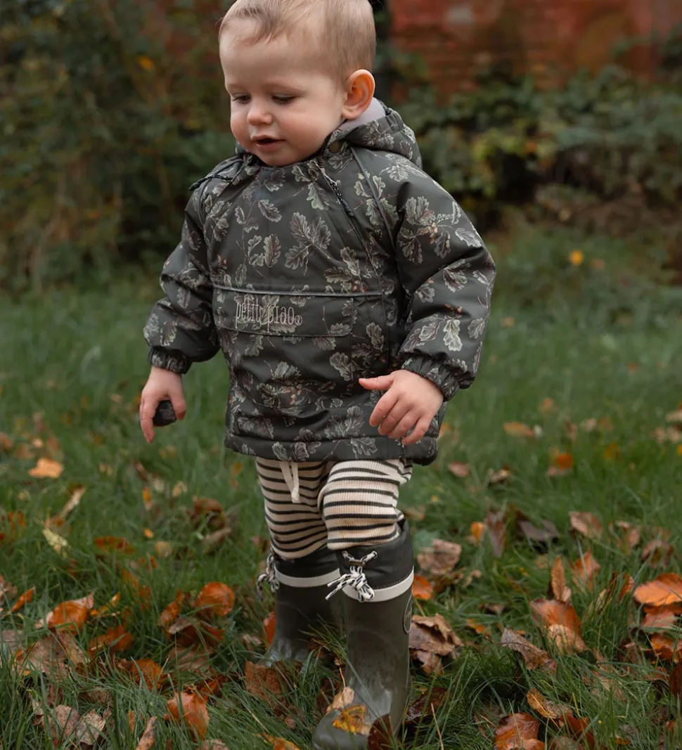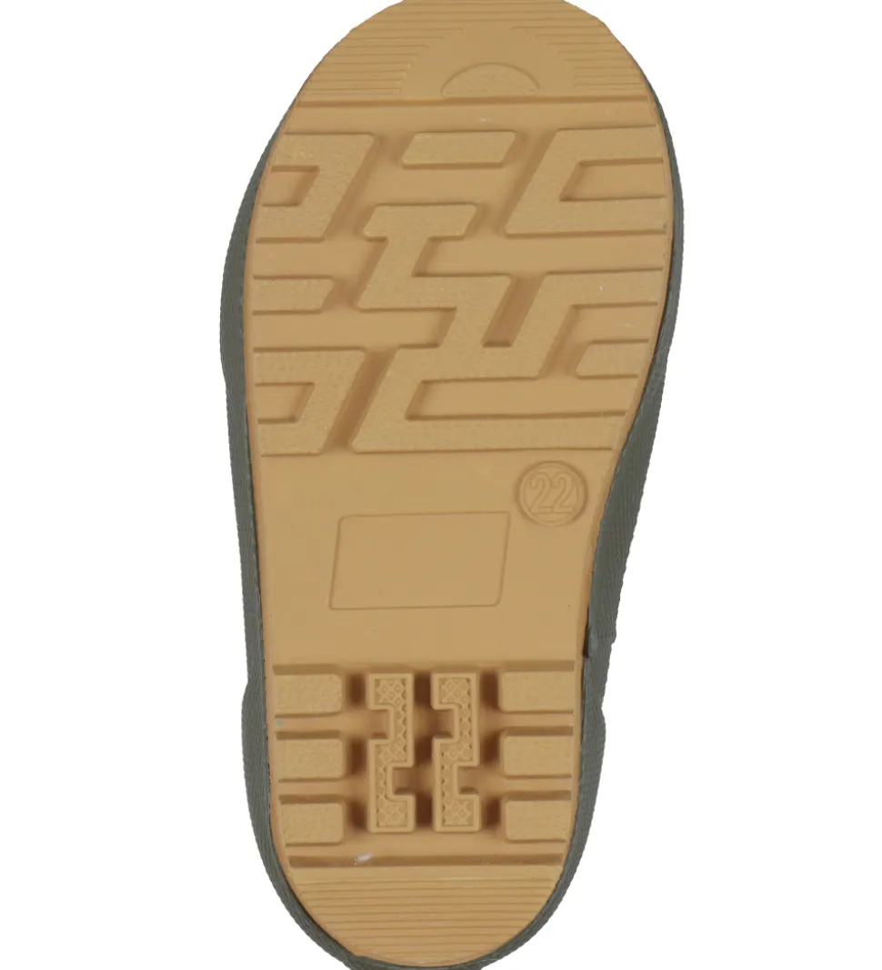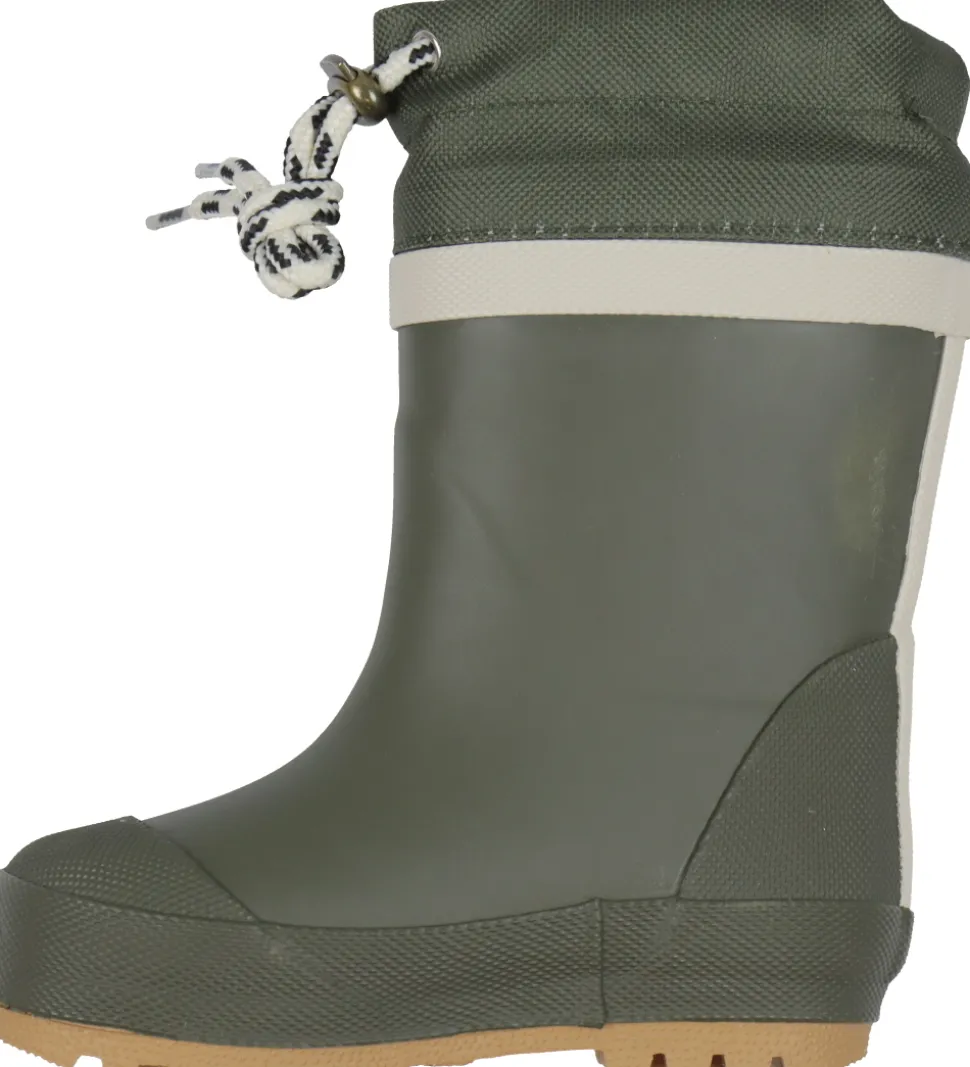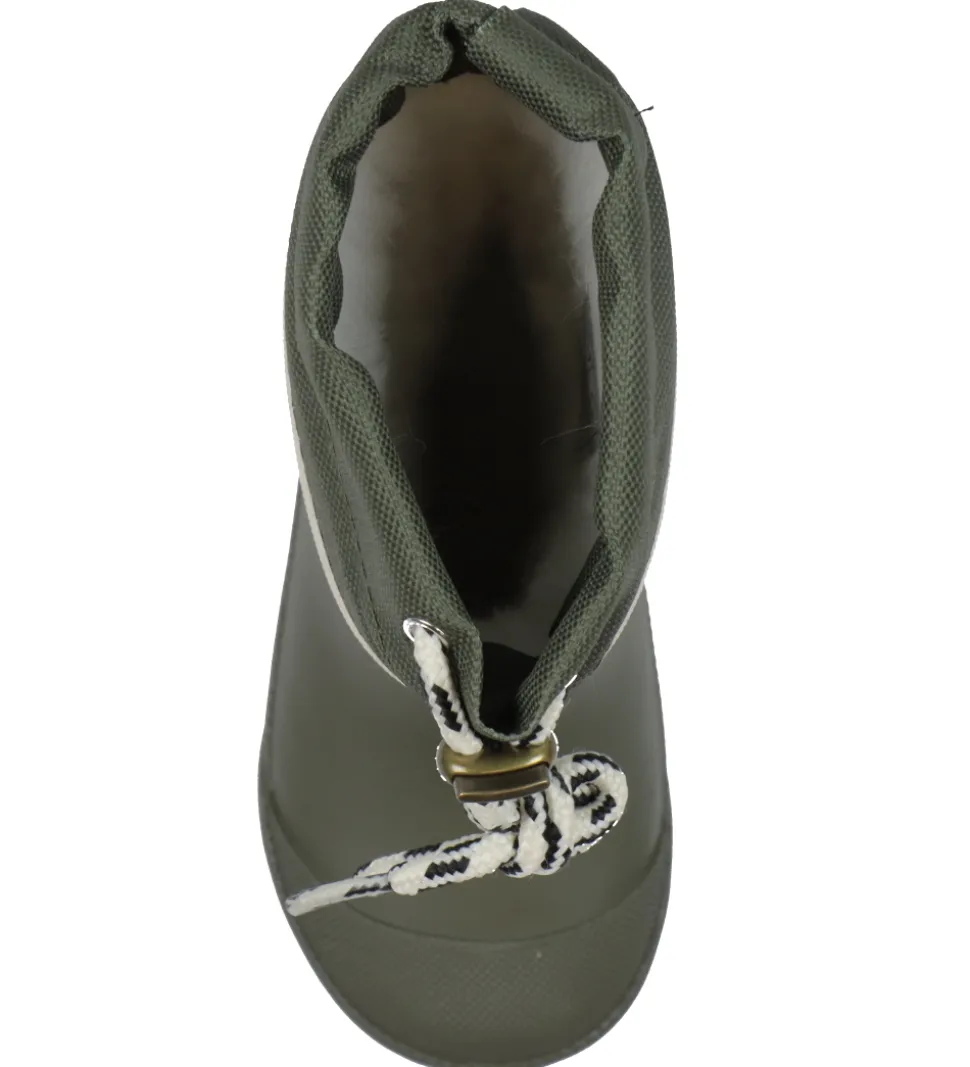 Seje Pom Pom termostøvler i armygrøn naturgummi med en hvid stribe i toppen.