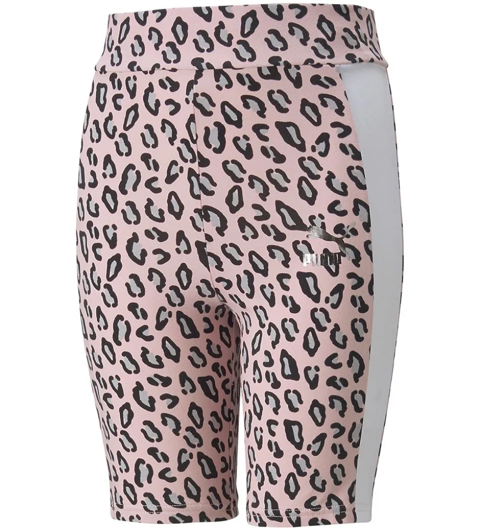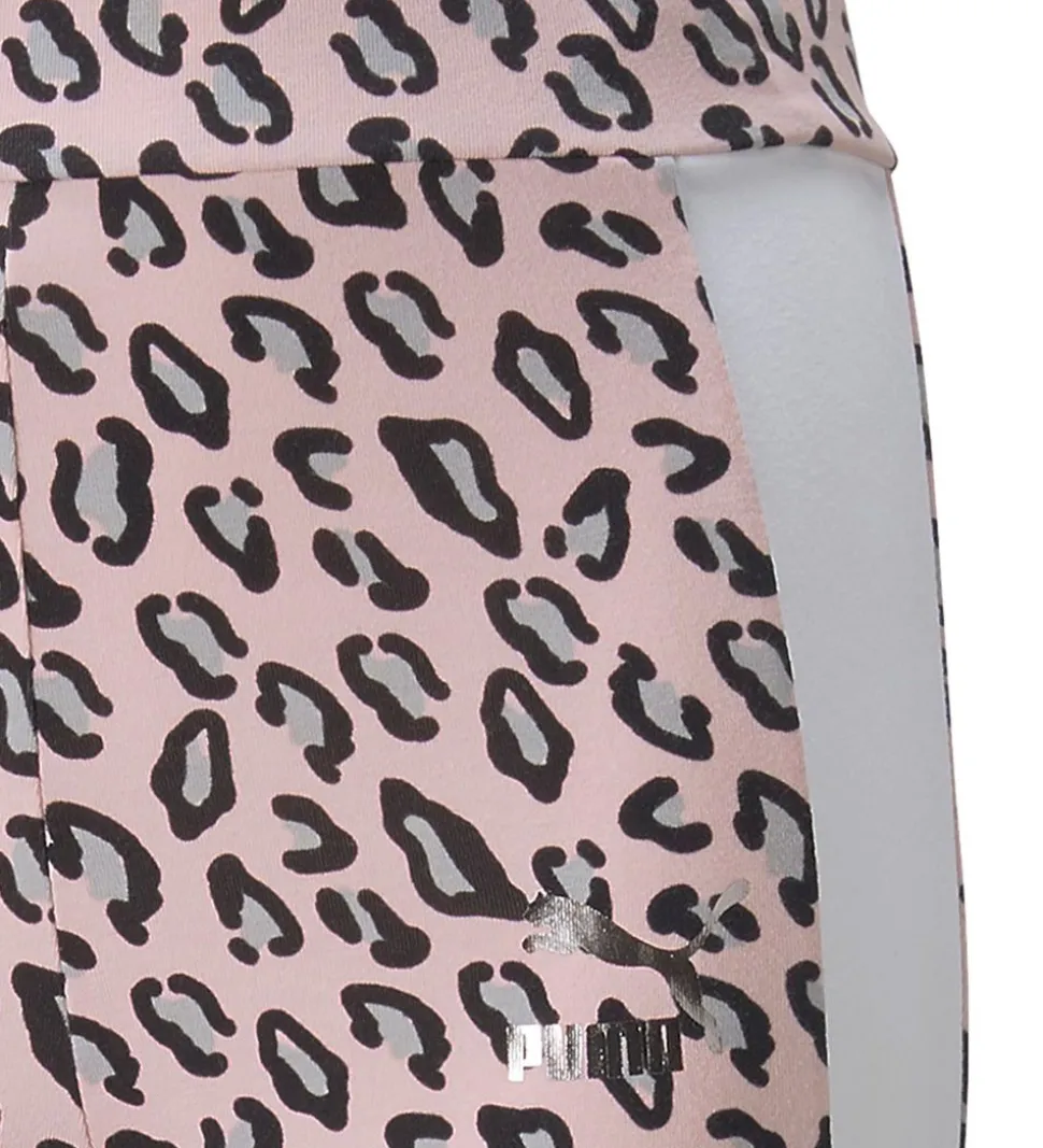 Flotte Puma cykelshorts i rosa med et allover leopard-print. På venstre bukseben er der et sølvfarvet Puma-logo med holografisk effekt, og ned langs ydersiden af buksebenene er der en hvid stribe.