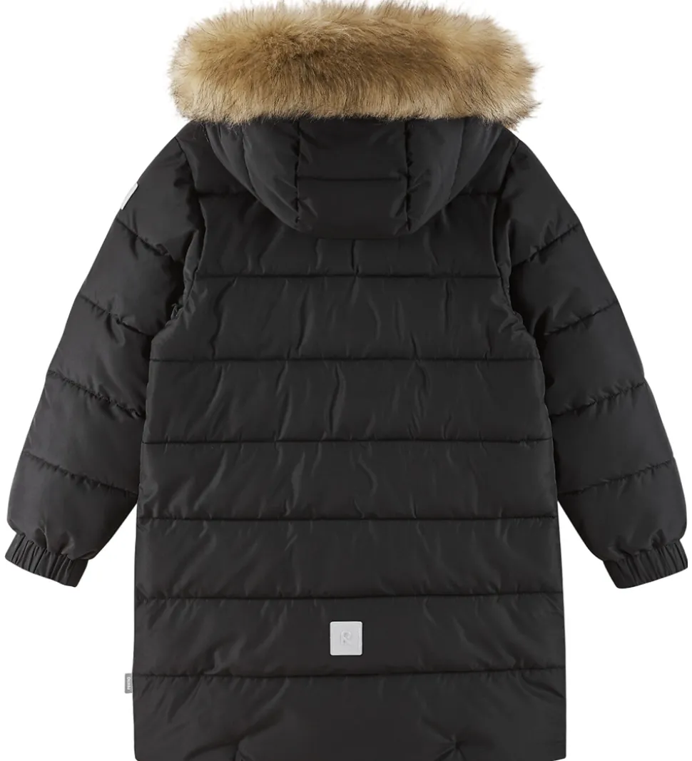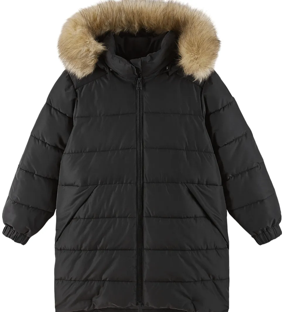 Lækker Reima dynefrakke i ensartet sort med vandrette syninger, og har en flot kant af imiteret pels.