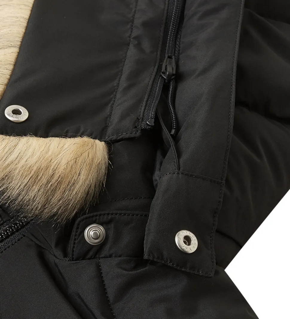 Reima dynefrakken er en lang model, der går lidt ned over lårene og numsen. Dynefrakken har en aftagelig hætte, som fæstnes langs den høje halskrave med skjulte trykknapper, og pelskanten sidder fast med en lynlås. Ærmerne har elastikanter.