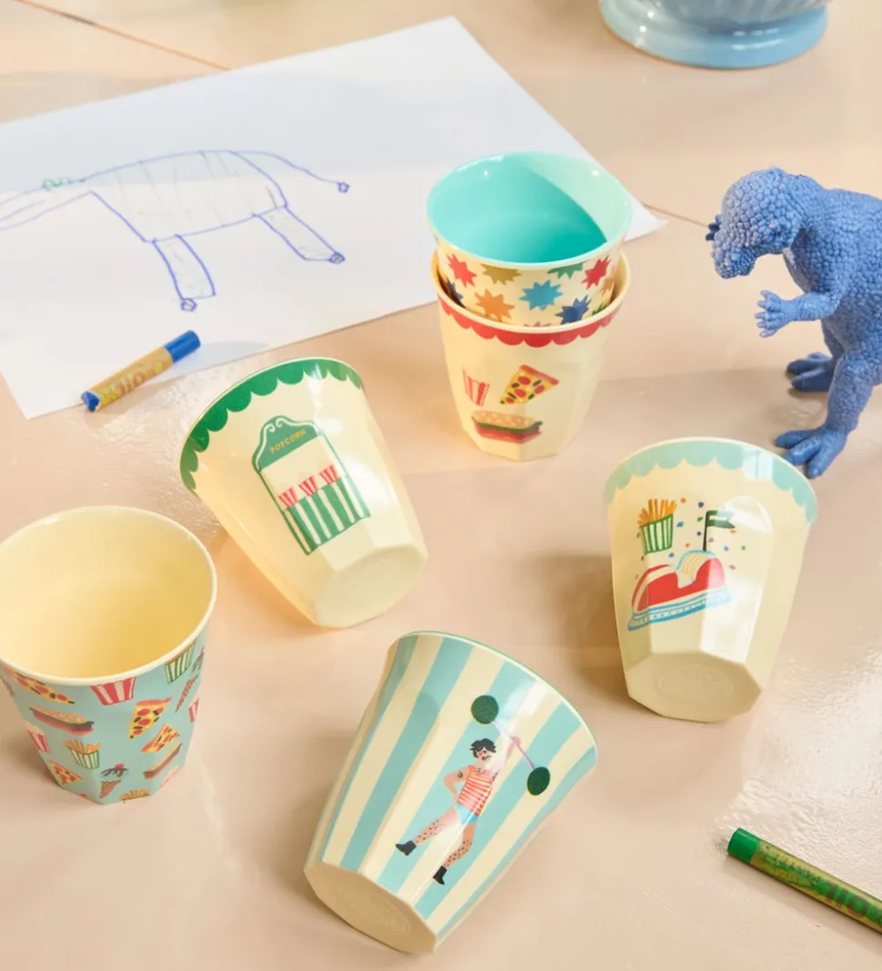 Farverige Rice kopper solgt i en 6-pak med et charmerende print af mad og cirkusmotiver.