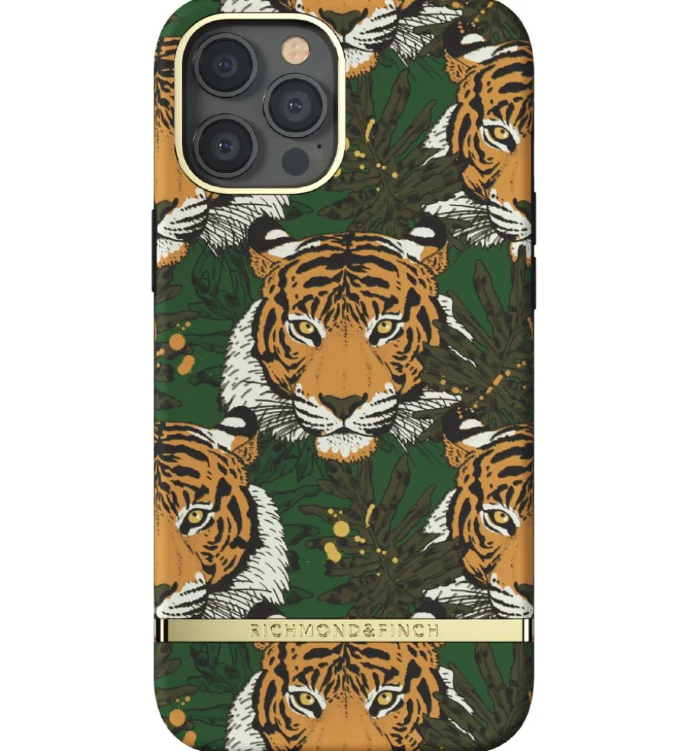 Lækkert Richmond & Finch mobilcover i mørkegrøn med et imponerende tigerprint og med en smuk guldkant omkring kamerahullet og en guld logokant nederst på coveret.