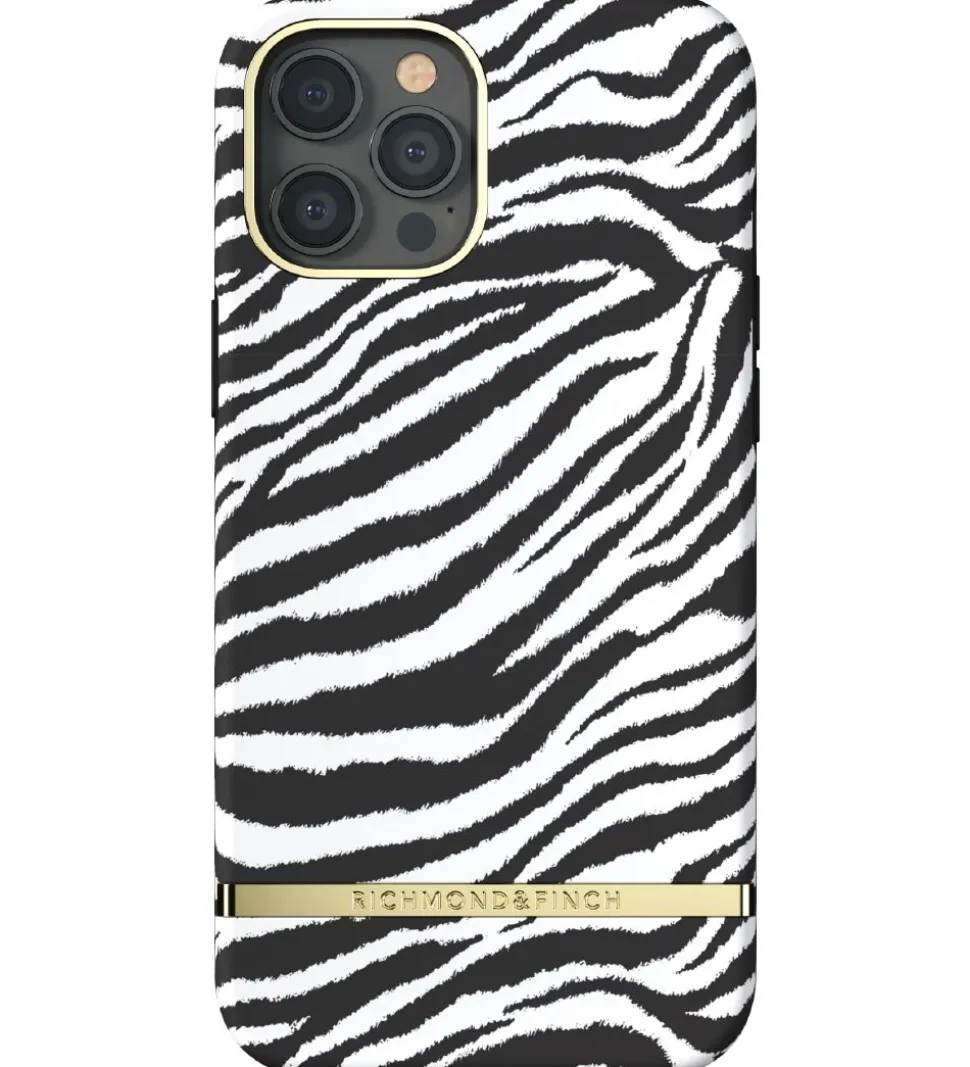 Lækkert Richmond & Finch mobilcover i et sort og hvidt zebramønster med en smuk guldkant omkring kamerahullet og en guld logokant nederst på coveret.