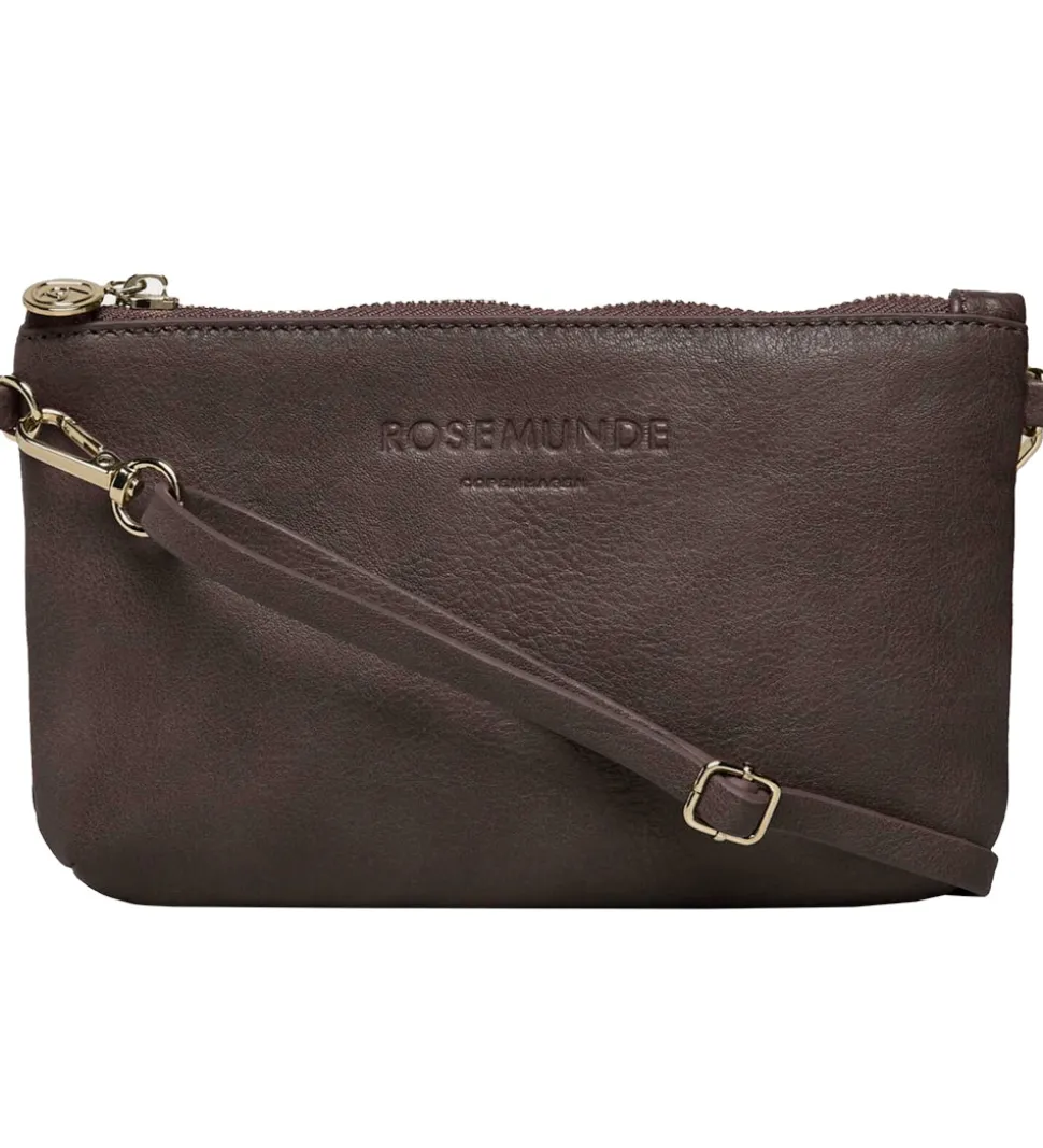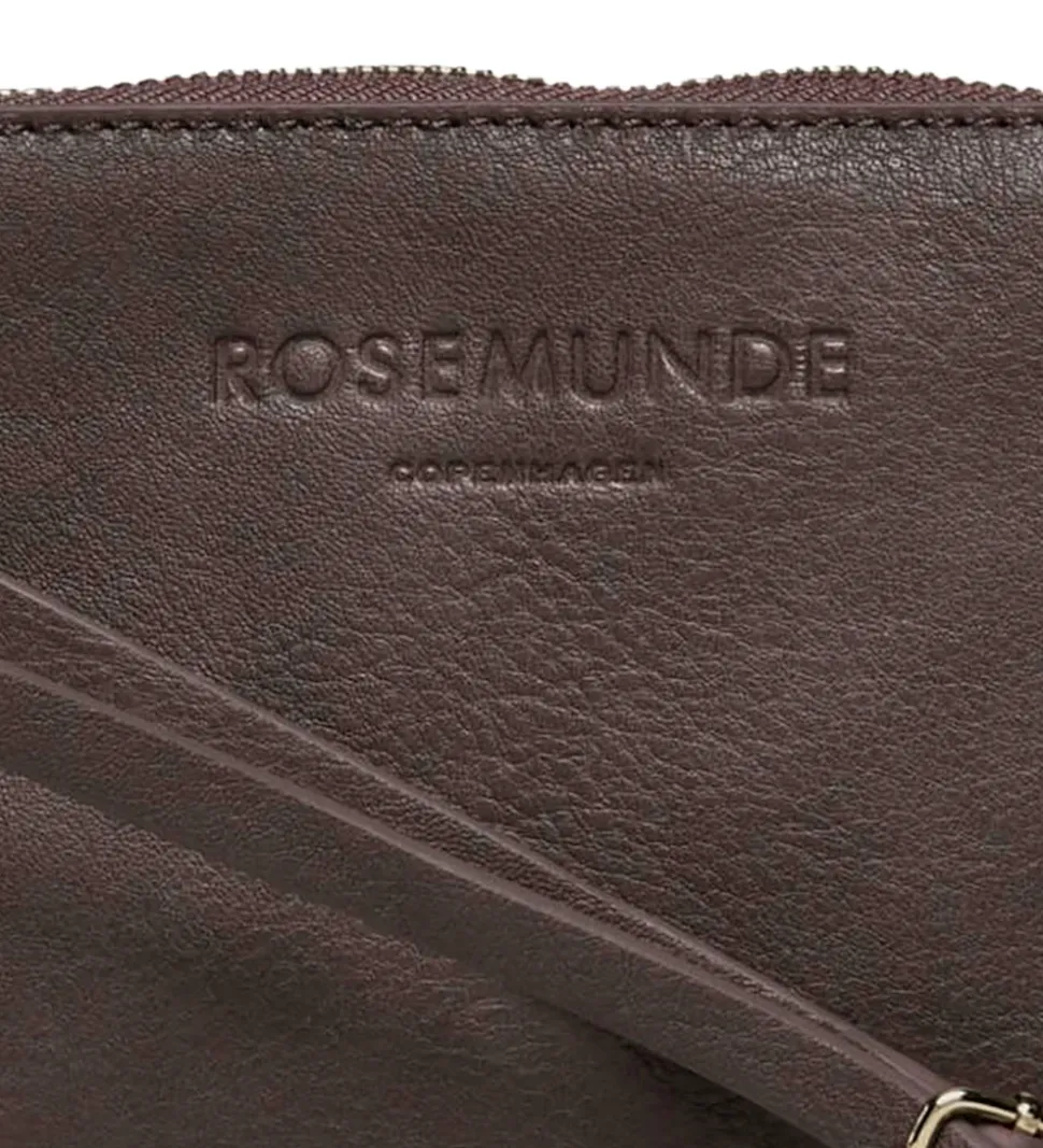 Fin Rosemunde clutch i mørkebrunt, imiteret læder med guld detaljer. Fortil er “Rosemunde Copenhagen” præget ind i læderet.