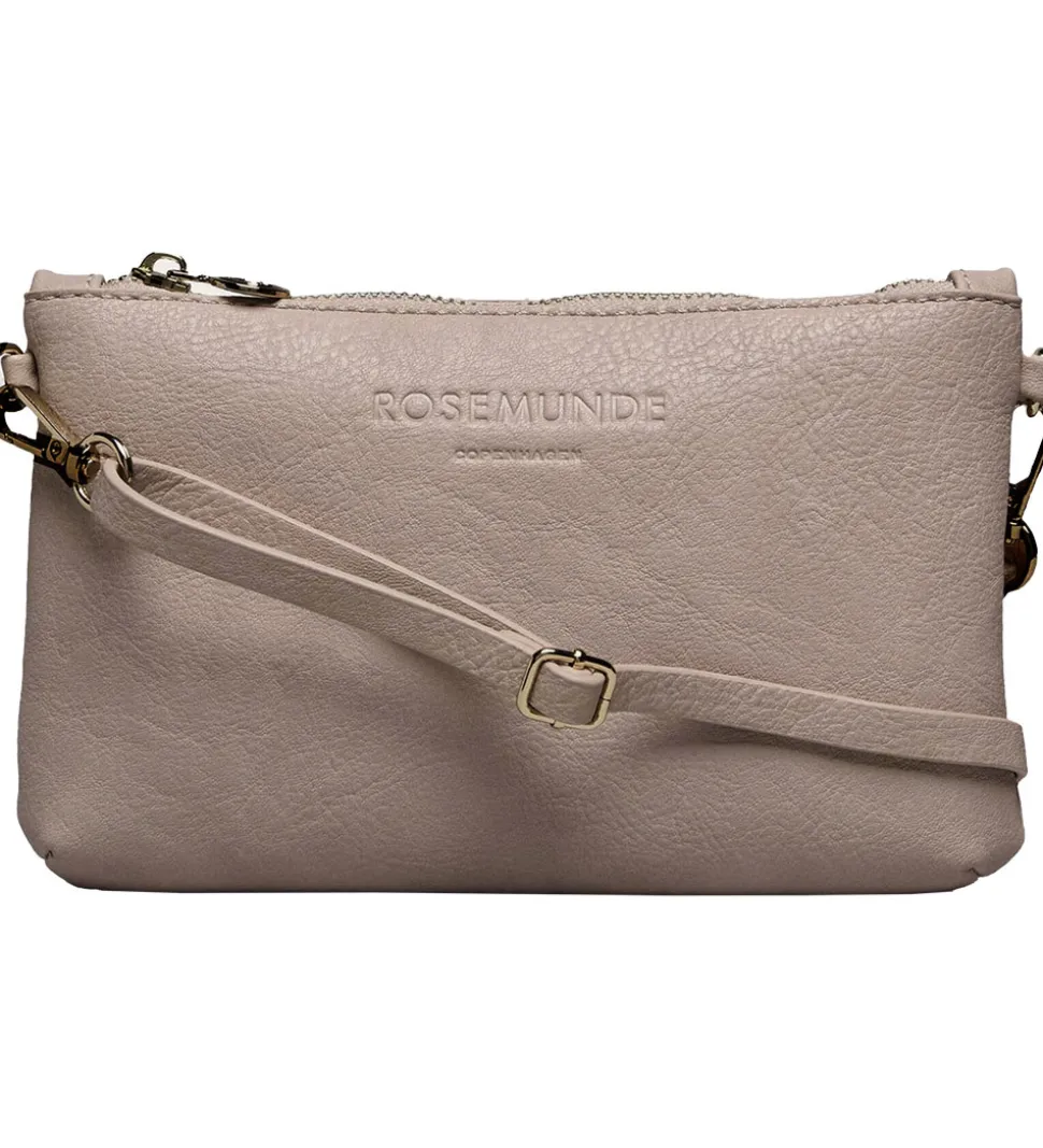 Smart Rosemunde clutch i lysegråt, imiteret læder med “Rosemunde Copenhagen” præget ind i læderet.